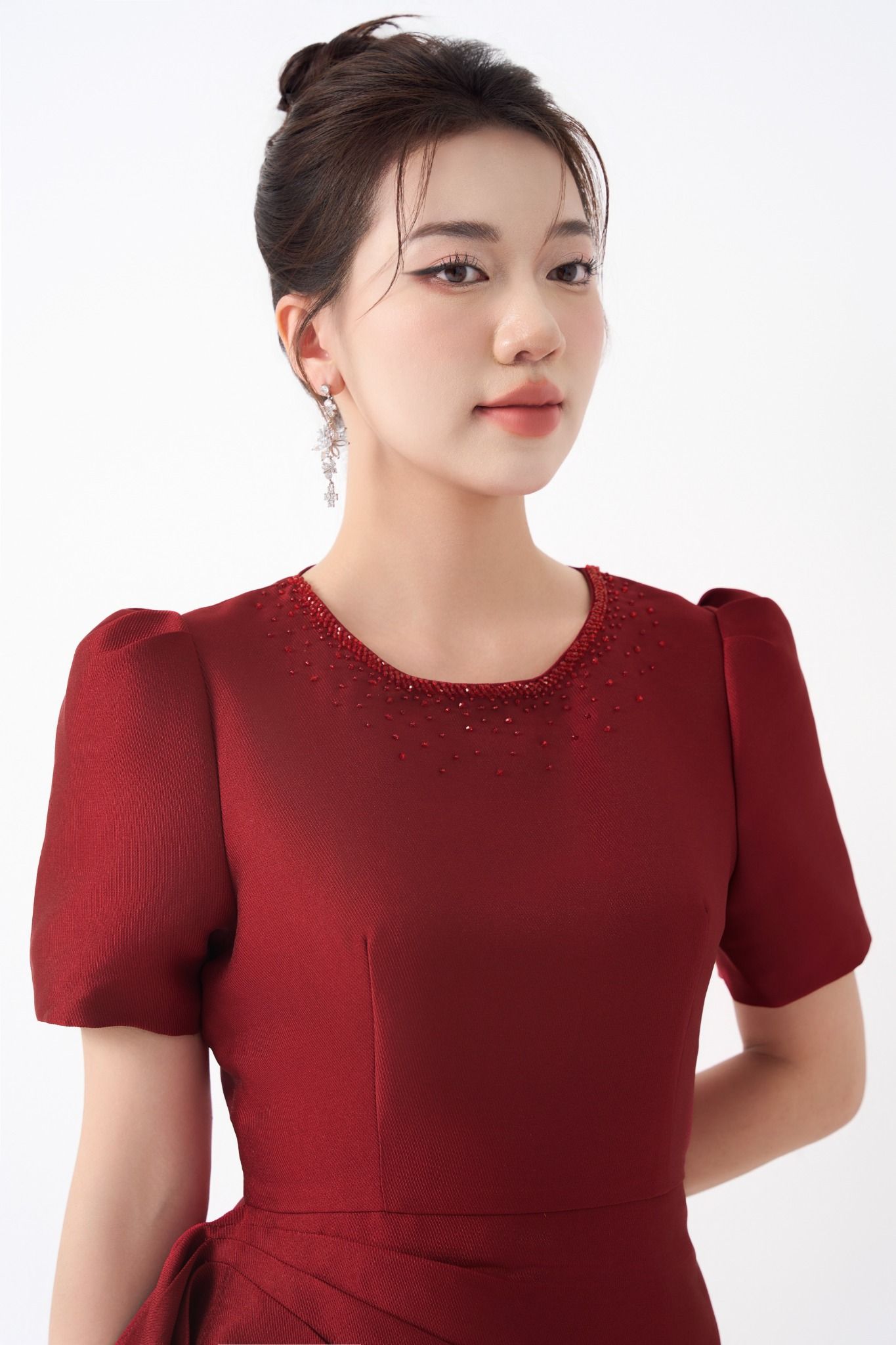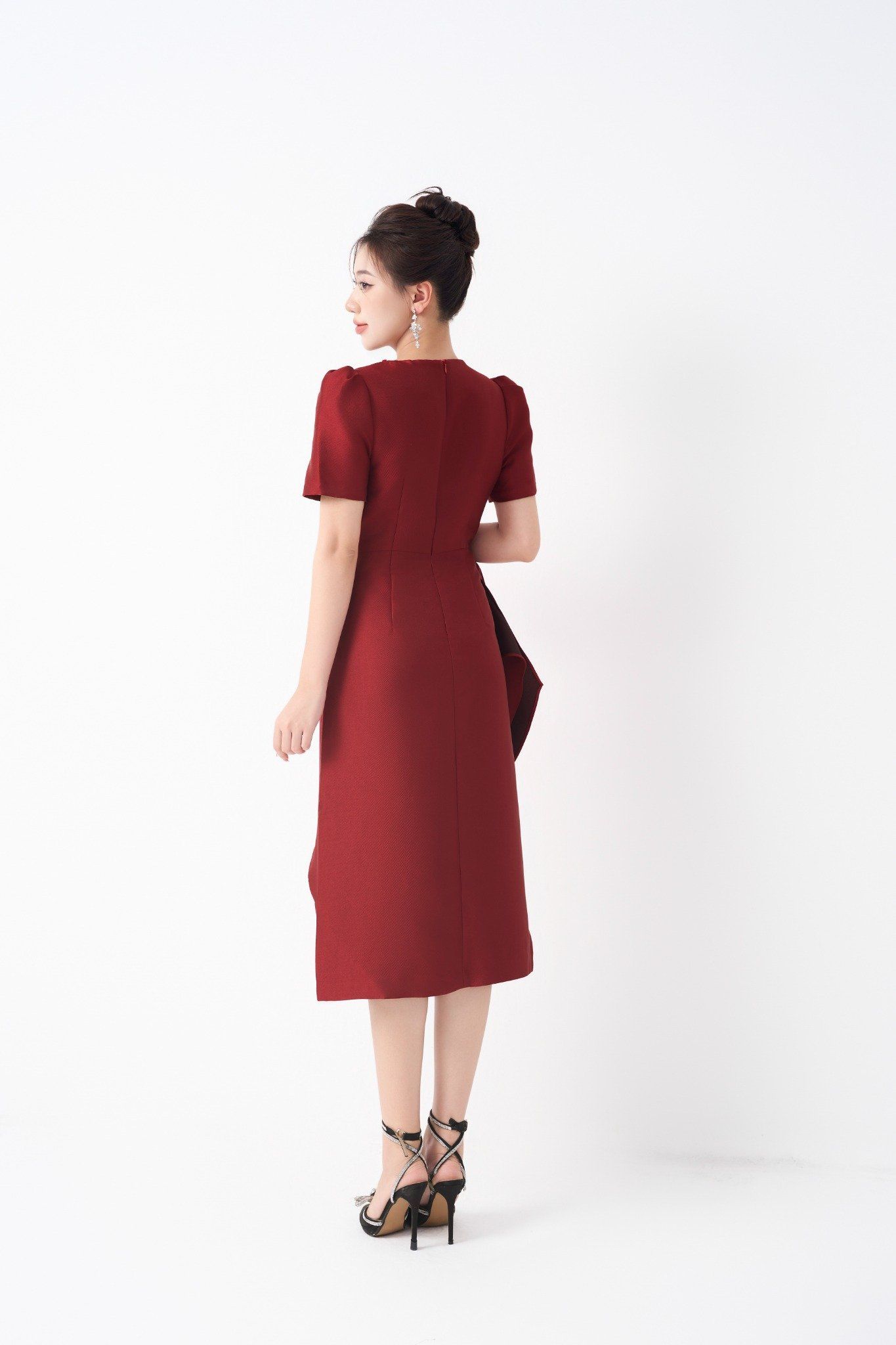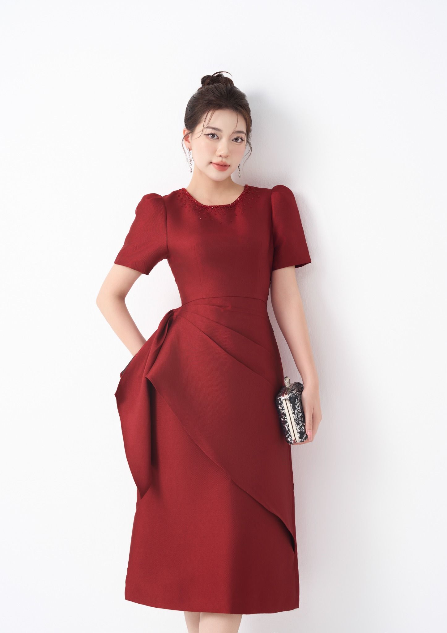 Kiểu dáng: đầm thiết kế dáng chữ A dài qua gối, tone màu đỏ, phần eo xếp cách điệu