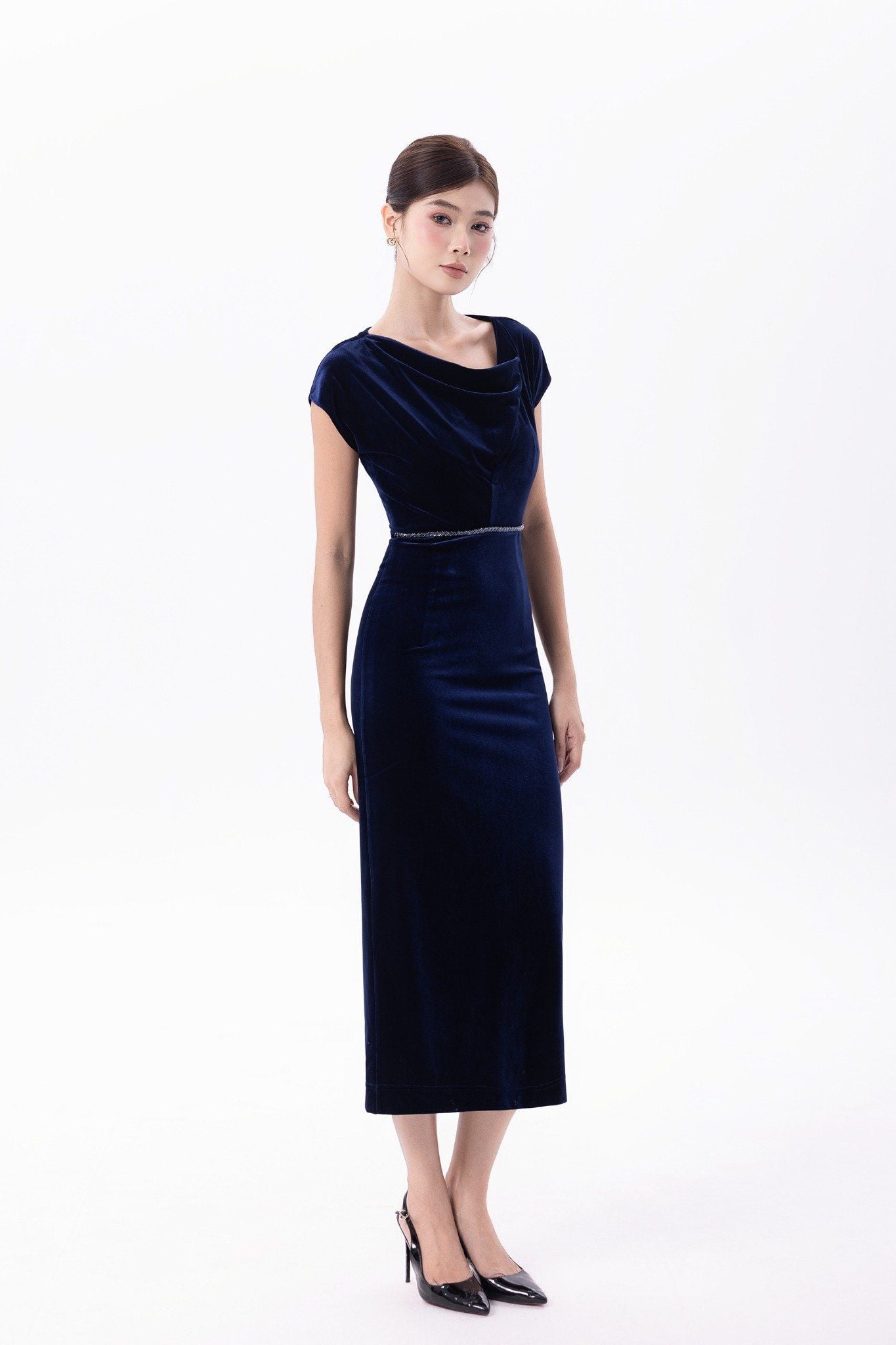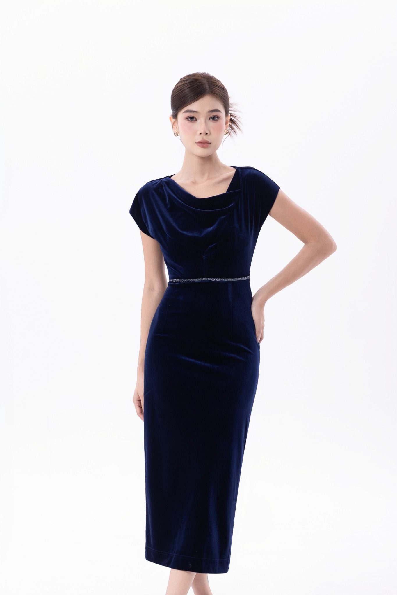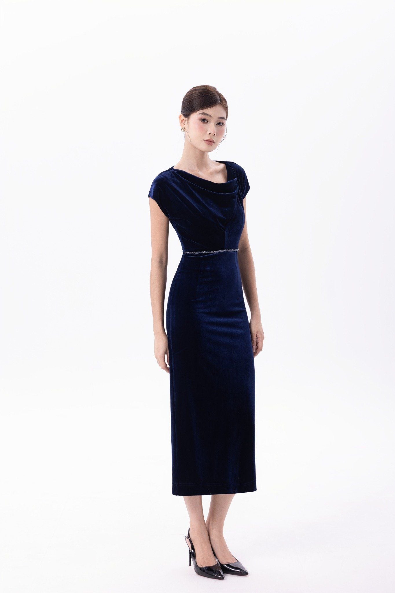 Kiểu dáng: đầm tiệc thiết kế dáng ôm giúp tôn dáng tối đa, độ ôm vừa phải cùng chi tiết xẻ phía sau giúp người mặc di chuyển dễ dàng và giữ được sự thoải mái, độ dài qua gối. Đầm sử dụng tone màu xanh than sang trọng, eo đính cườm nổi bật