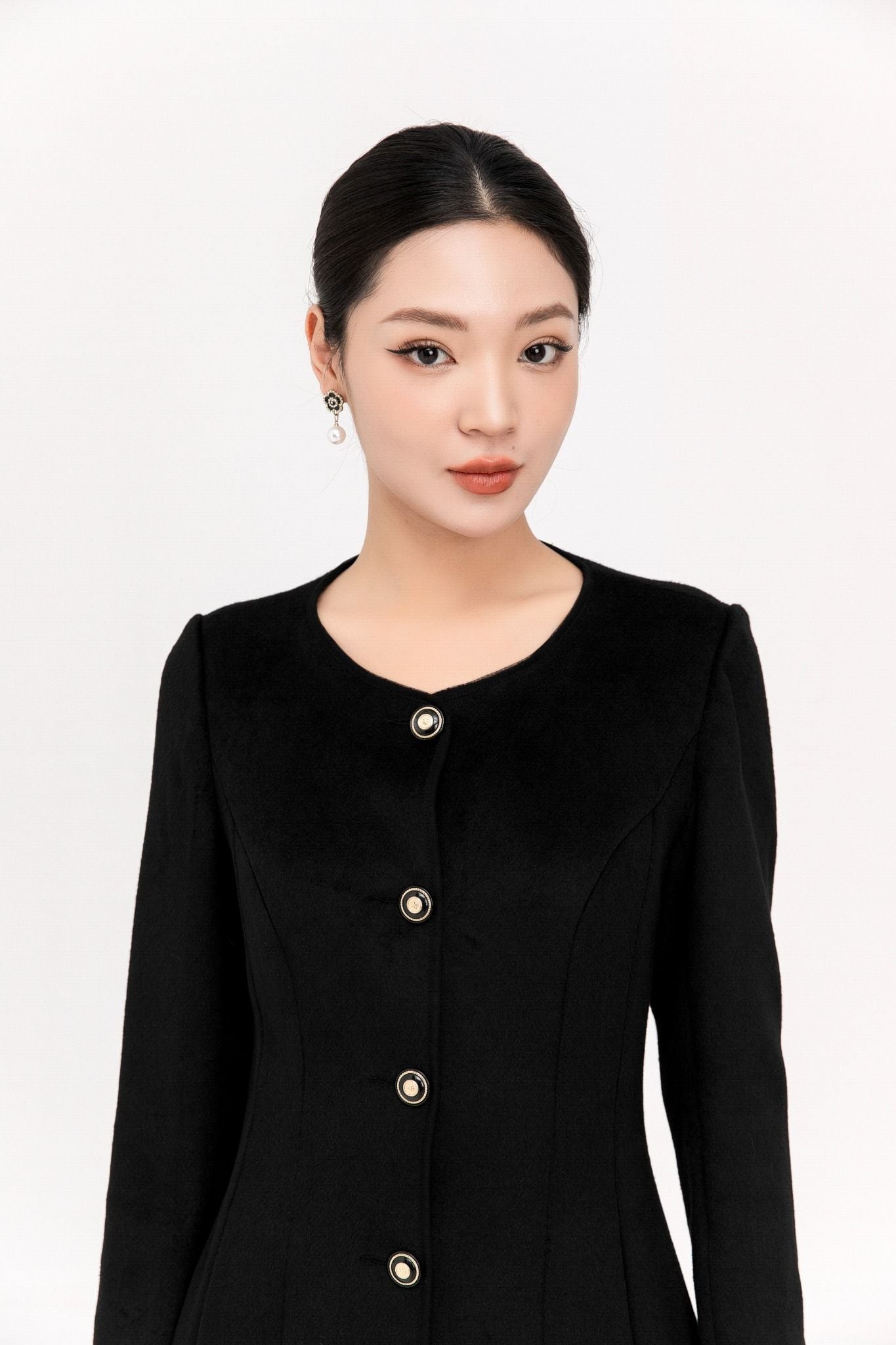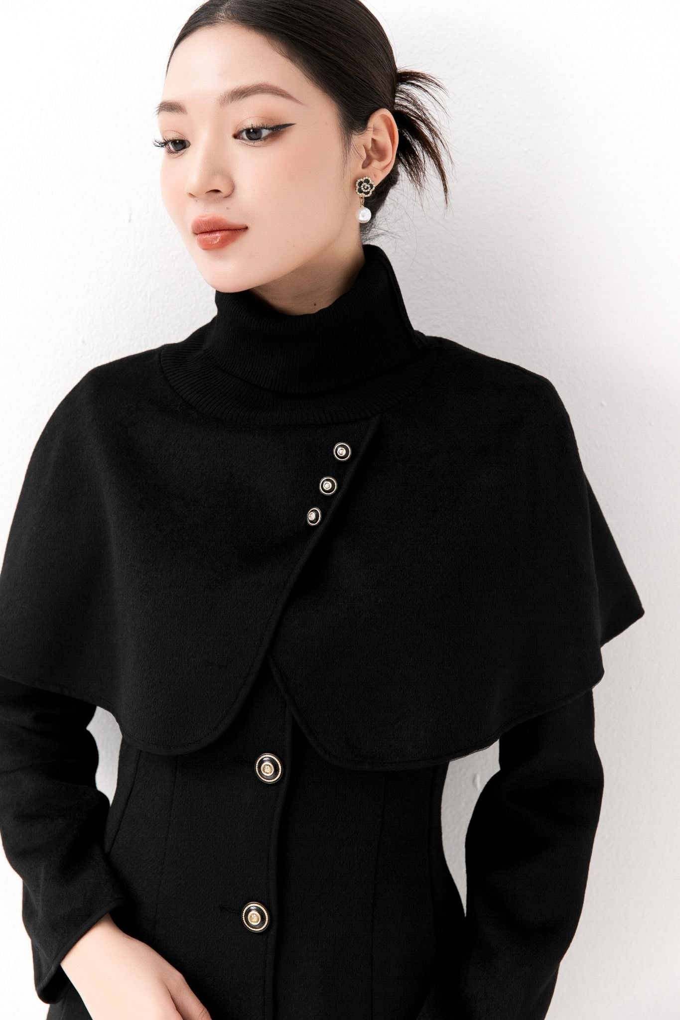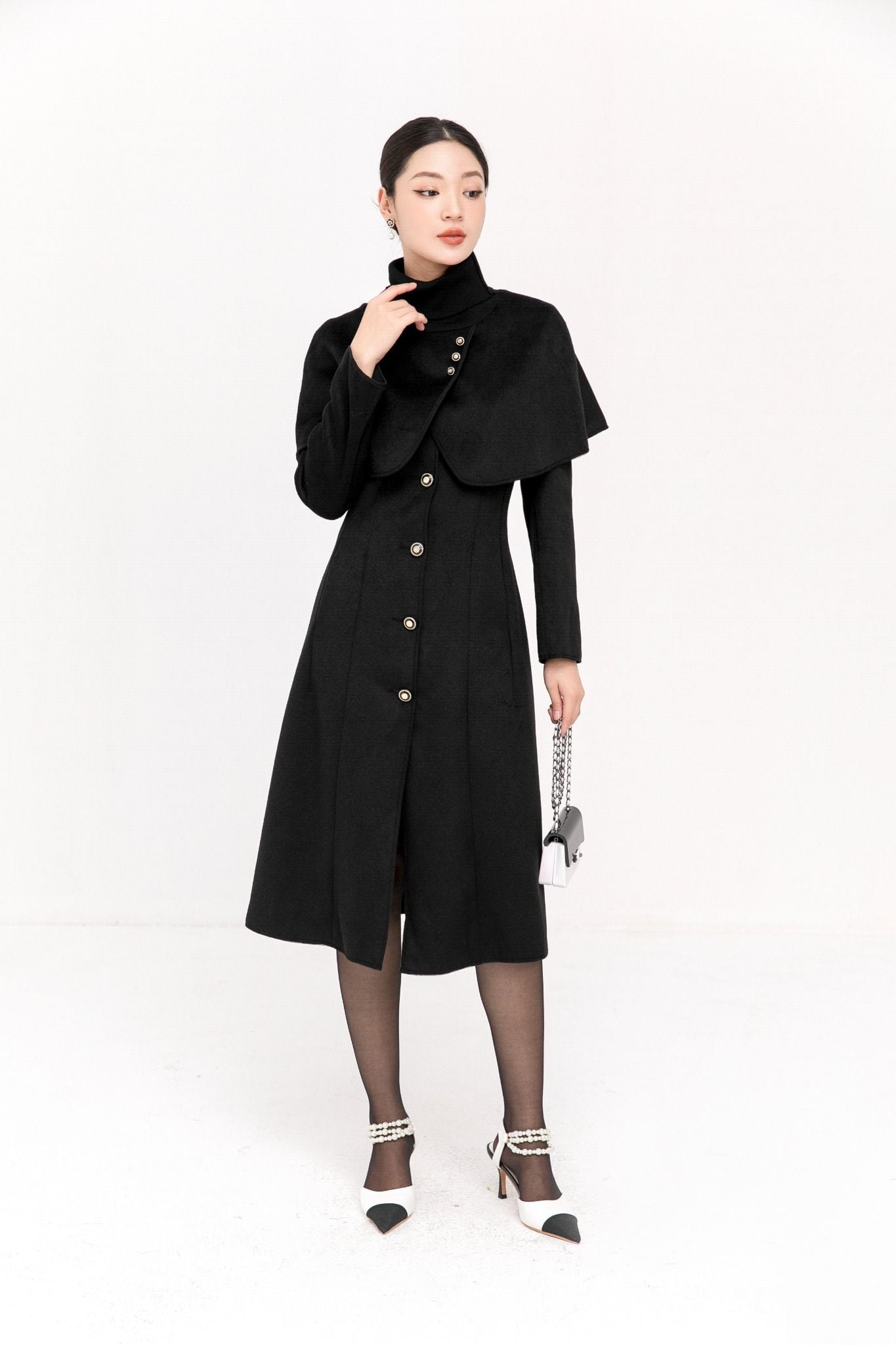 Kiểu dáng: áo măng tô thiết kế dáng dài, vai cape rời, tone màu đen trơn