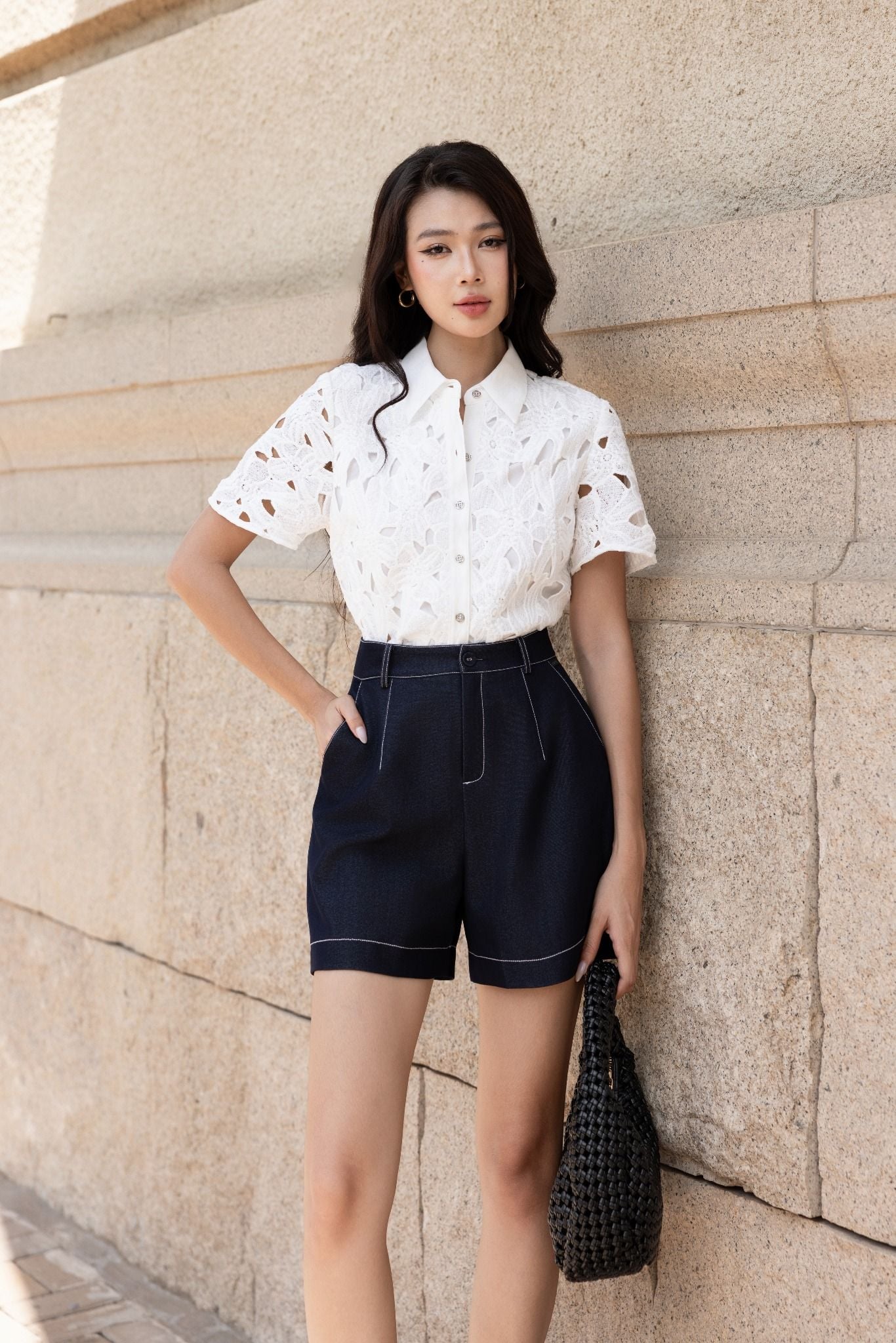 Kiểu dáng: quần short thiết kế dáng ống rộng, tone màu xanh đậm phối chỉ trắng
