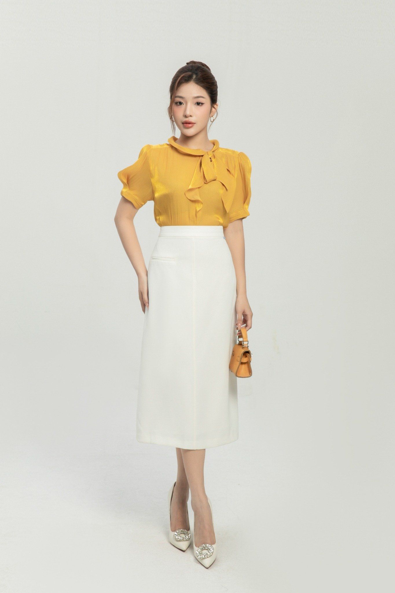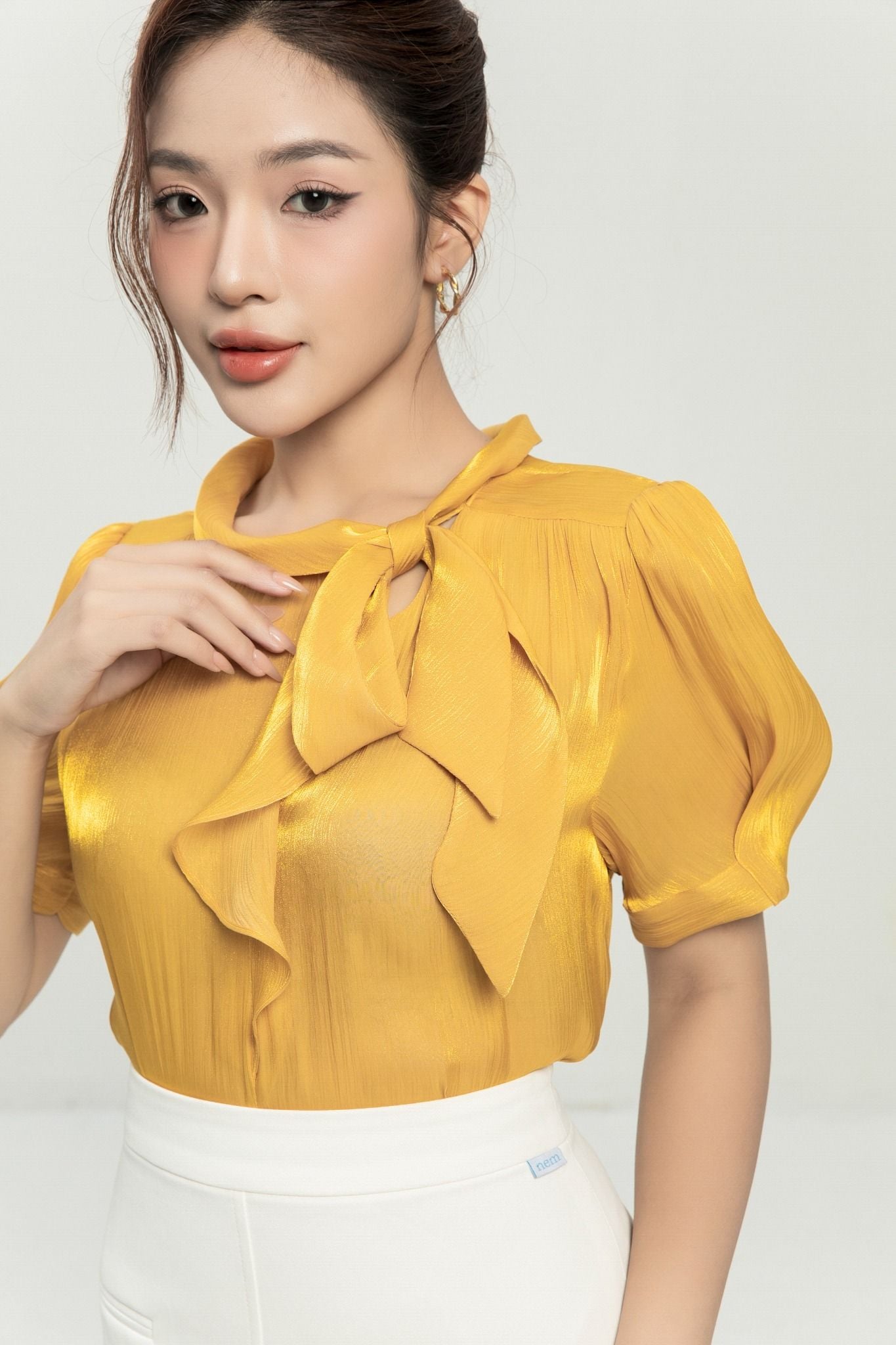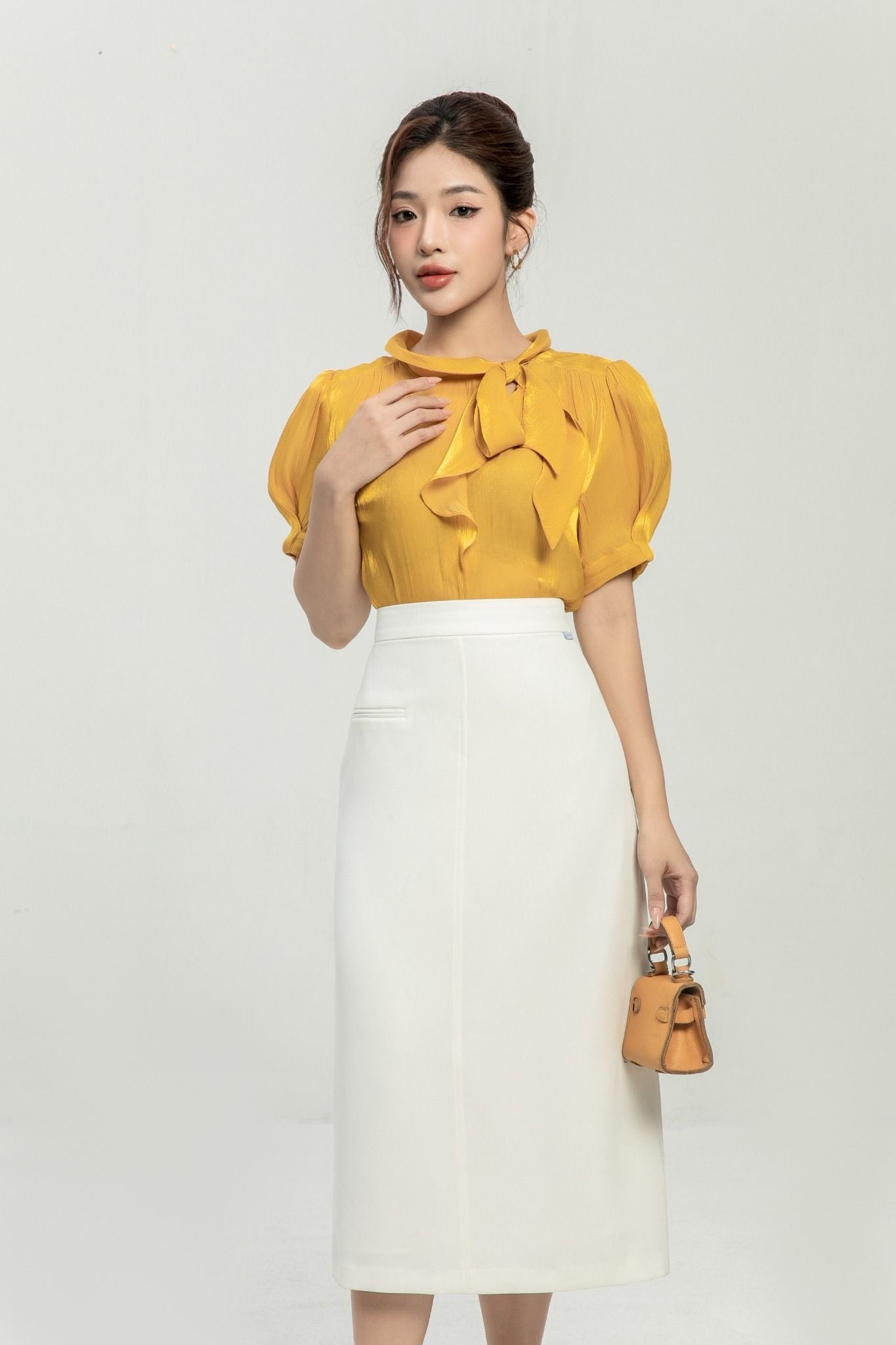 Kiểu dáng: áo sơ mi thiết kế dáng suông, tone màu vàng trơn, cổ phối nơ
