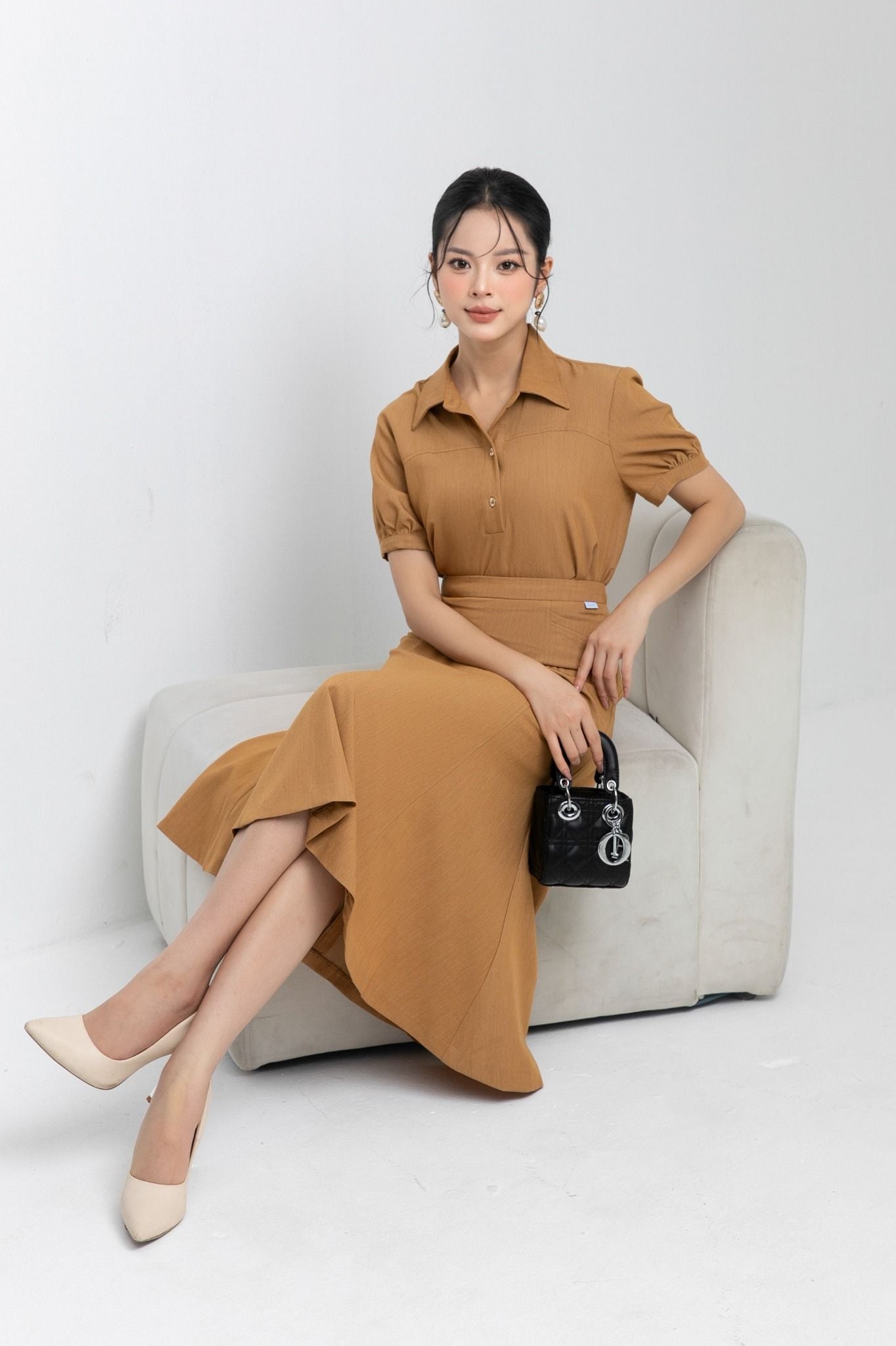 Kiểu dáng: áo sơ mi thiết kế cổ bẻ, tay bồng, tone màu nâu trơn