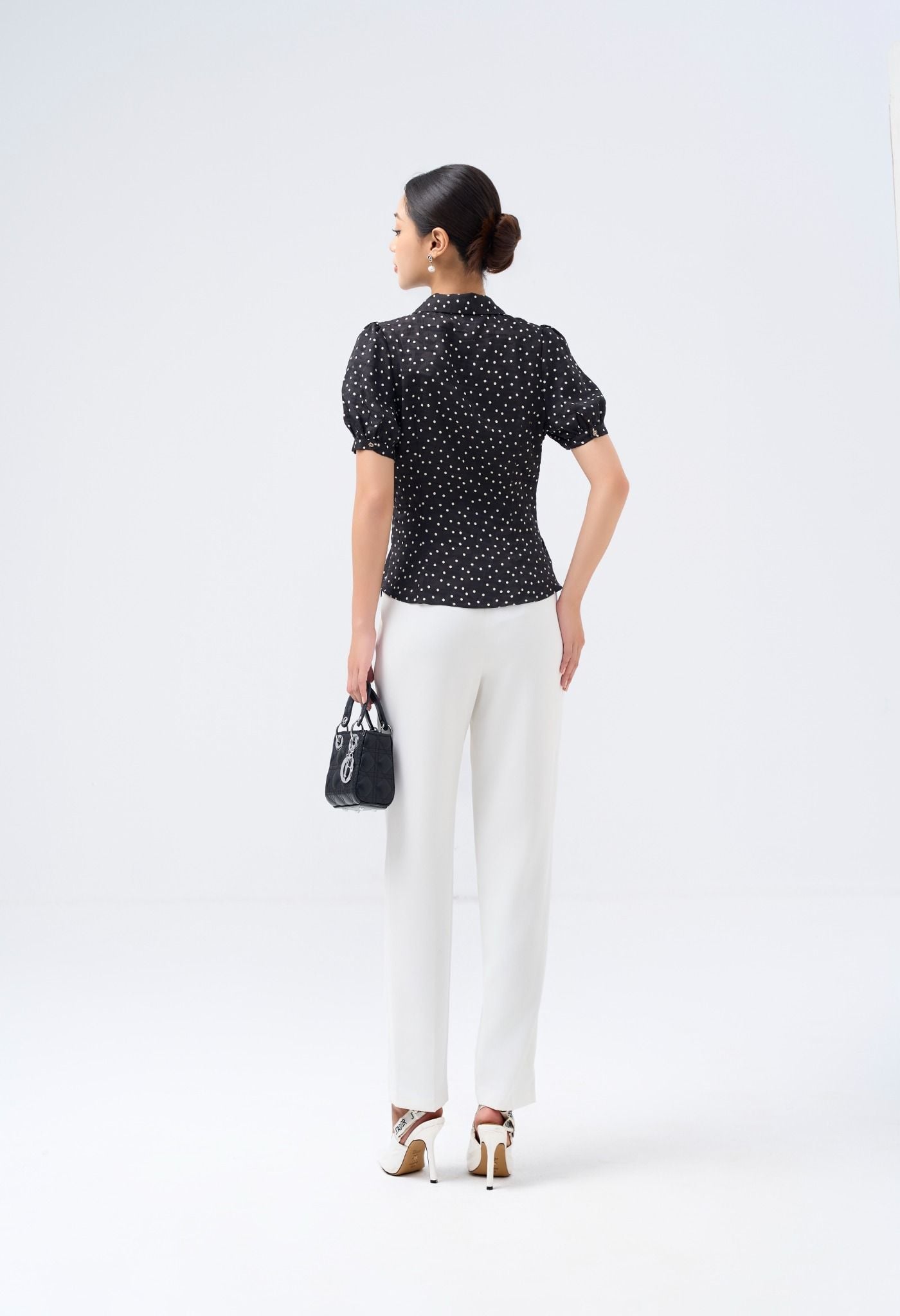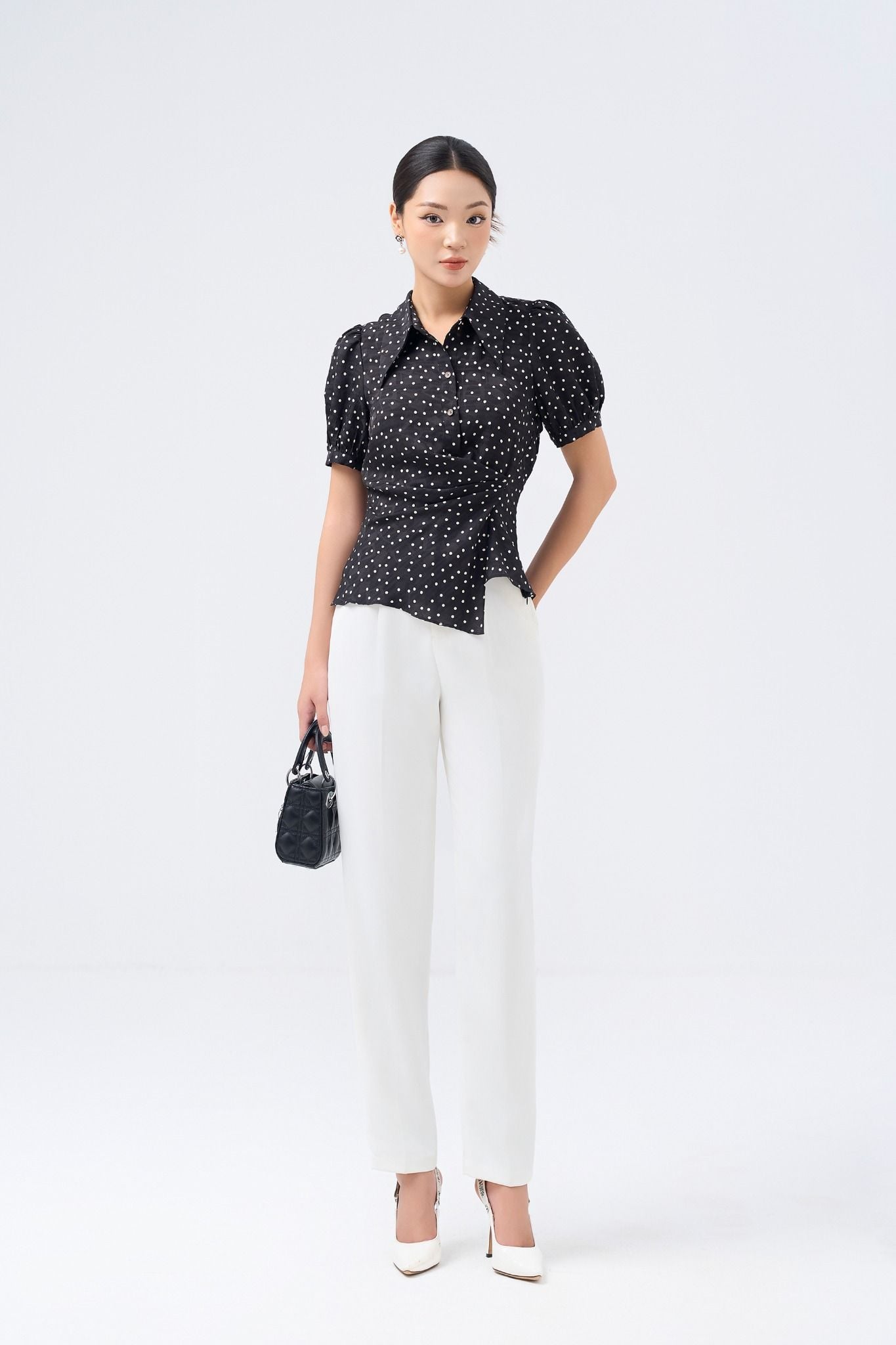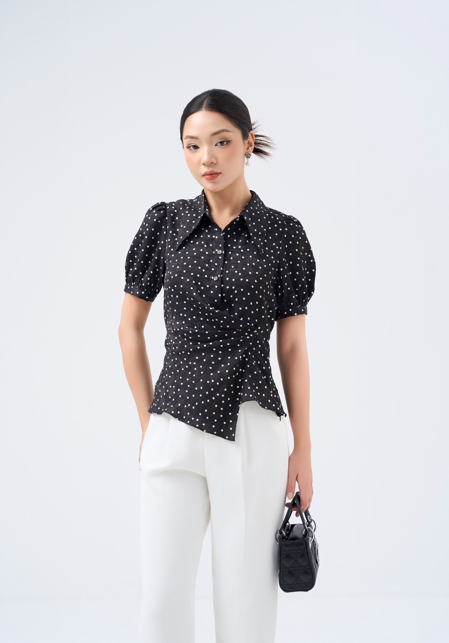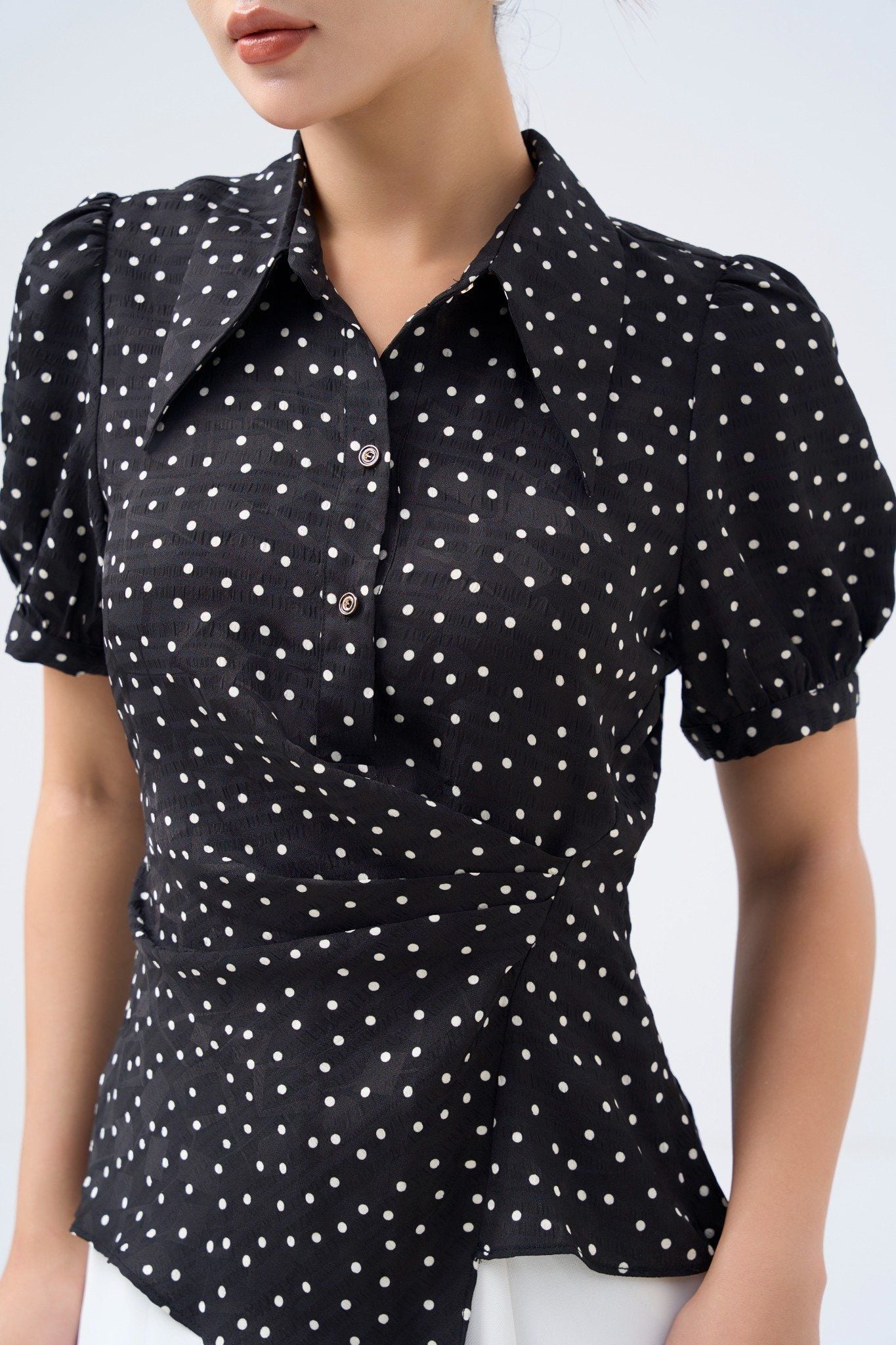 Kiểu dáng: áo sơ thiết kế cổ bẻ, phần eo cách điệu, tone màu đen phối họa tiết chấm bi trắng