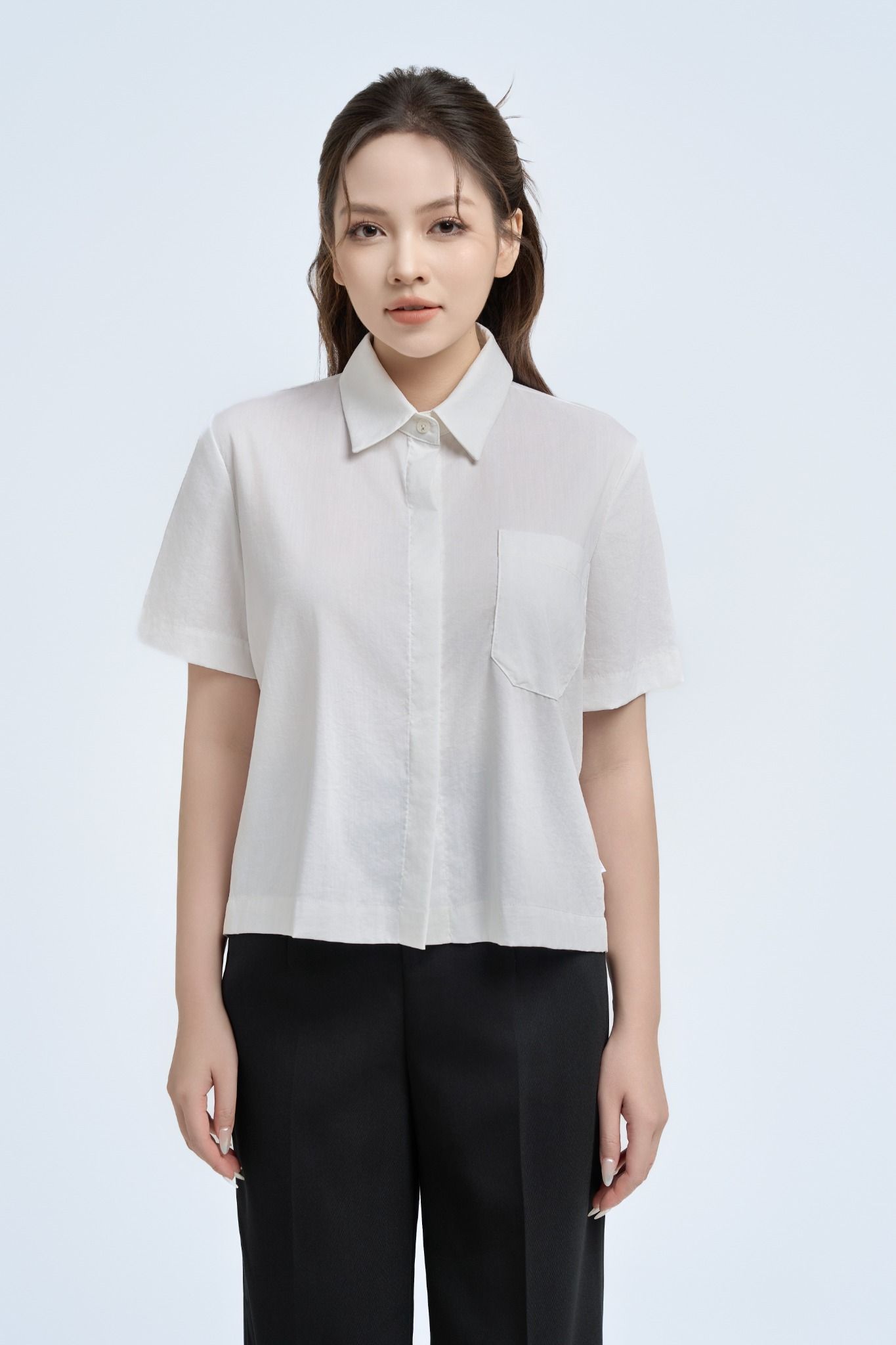 Kiểu dáng: áo sơ thiết kế cổ bẻ, tone màu trắng trơn