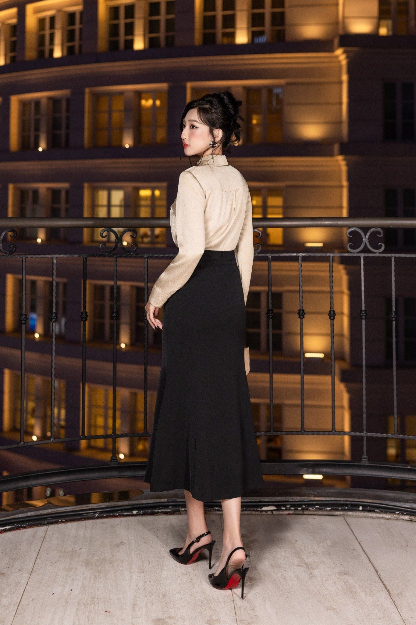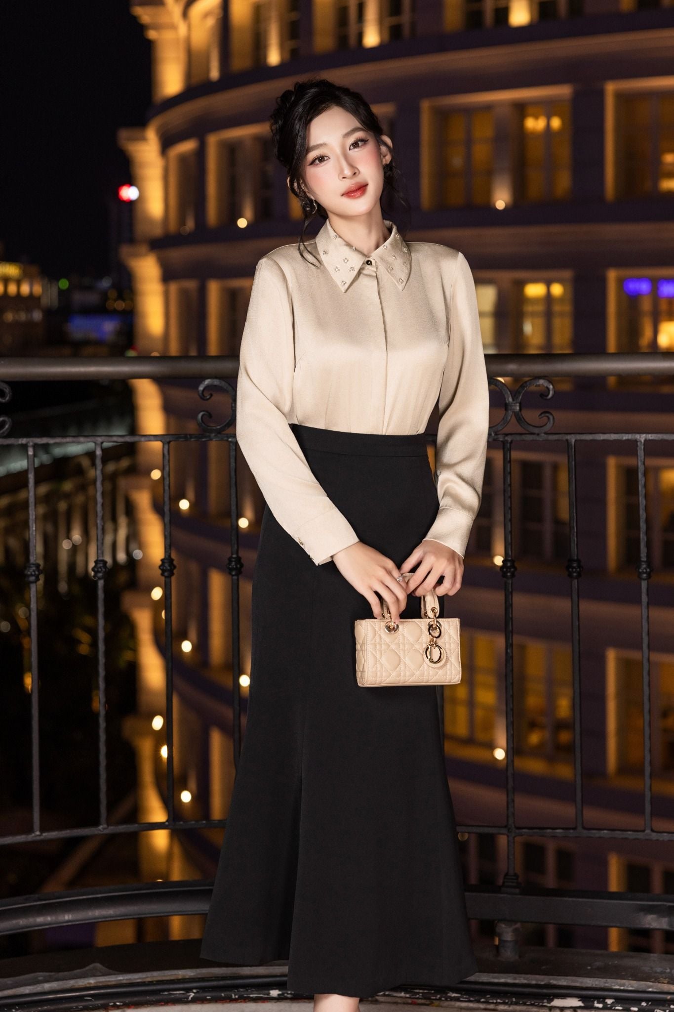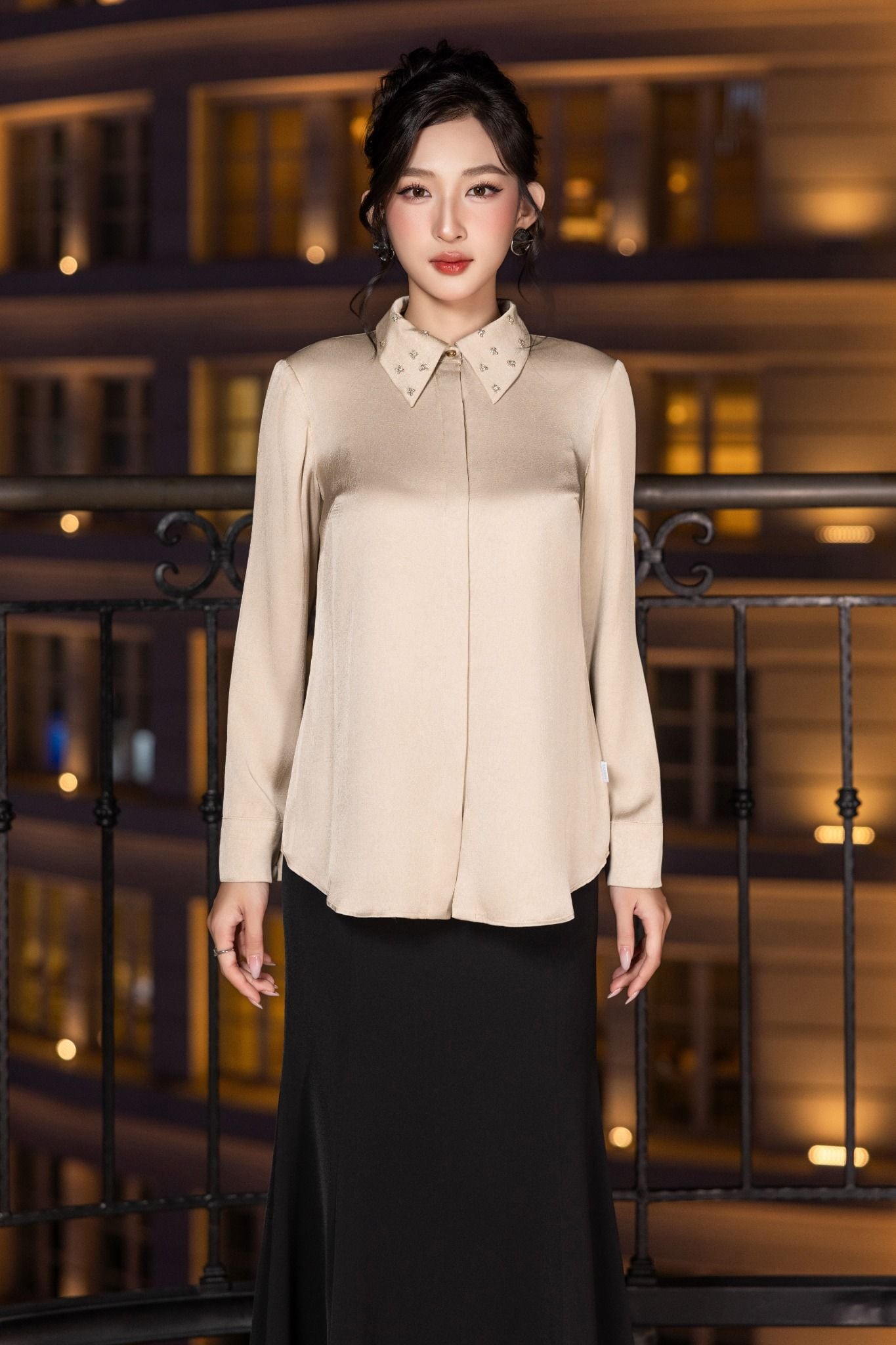Kiểu dáng: áo sơ mi thiết kế tay dài bồng nhẹ, áo dáng suông và chiều dài áo vừa phải có thể sơ vin hoặc thả suông. Áo sử dụng tone màu nâu thanh lịch cùng cườm đính cổ áo tạo điểm nhấn