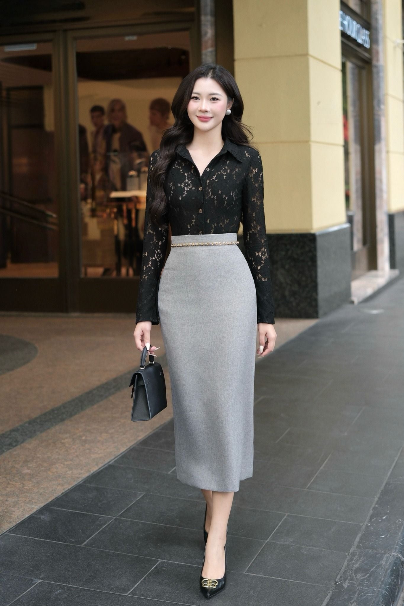 Kiểu dáng: áo sơ mi thiết kế tay dài, áo dáng chiết eo nhẹ và chiều dài áo vừa phải có thể sơ vin hoặc thả suông. Áo sử dụng tone màu đen sang trọng, kết hợp cổ bẻ truyền thống