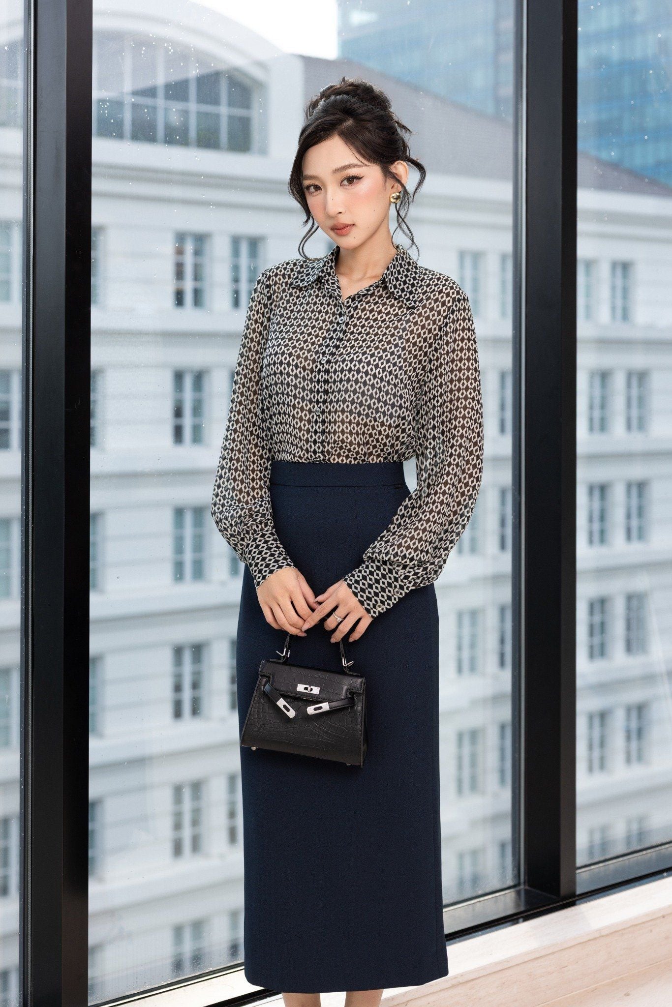 Kiểu dáng: áo sơ mi thiết kế tay dài bồng nhẹ, áo dáng suông và chiều dài áo vừa phải có thể sơ vin hoặc thả suông. Áo sử dụng hoạ tiết pha phối tone màu đen và trắng tạo điểm nhấn