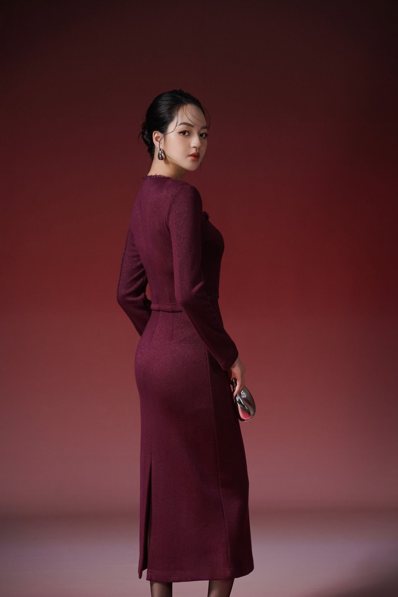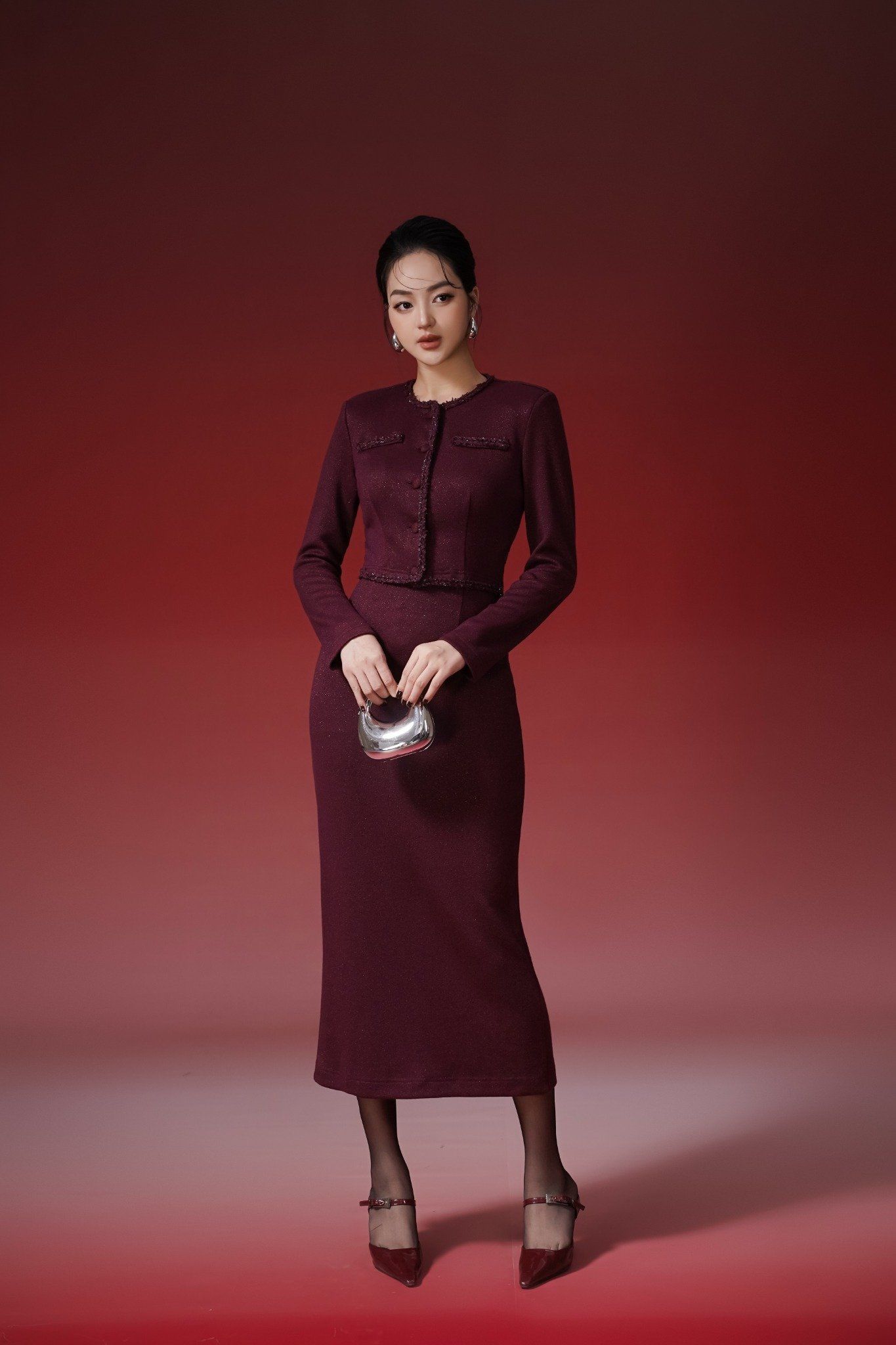 Kiểu dáng: áo công sở thiết kế dài tay, dáng ôm cùng chiều dài vừa phải giúp người mặc giữ được sự thanh lịch mà trẻ trung hơn các dáng áo truyền thống, áo sử dụng tone màu đỏ tím sang trọng
