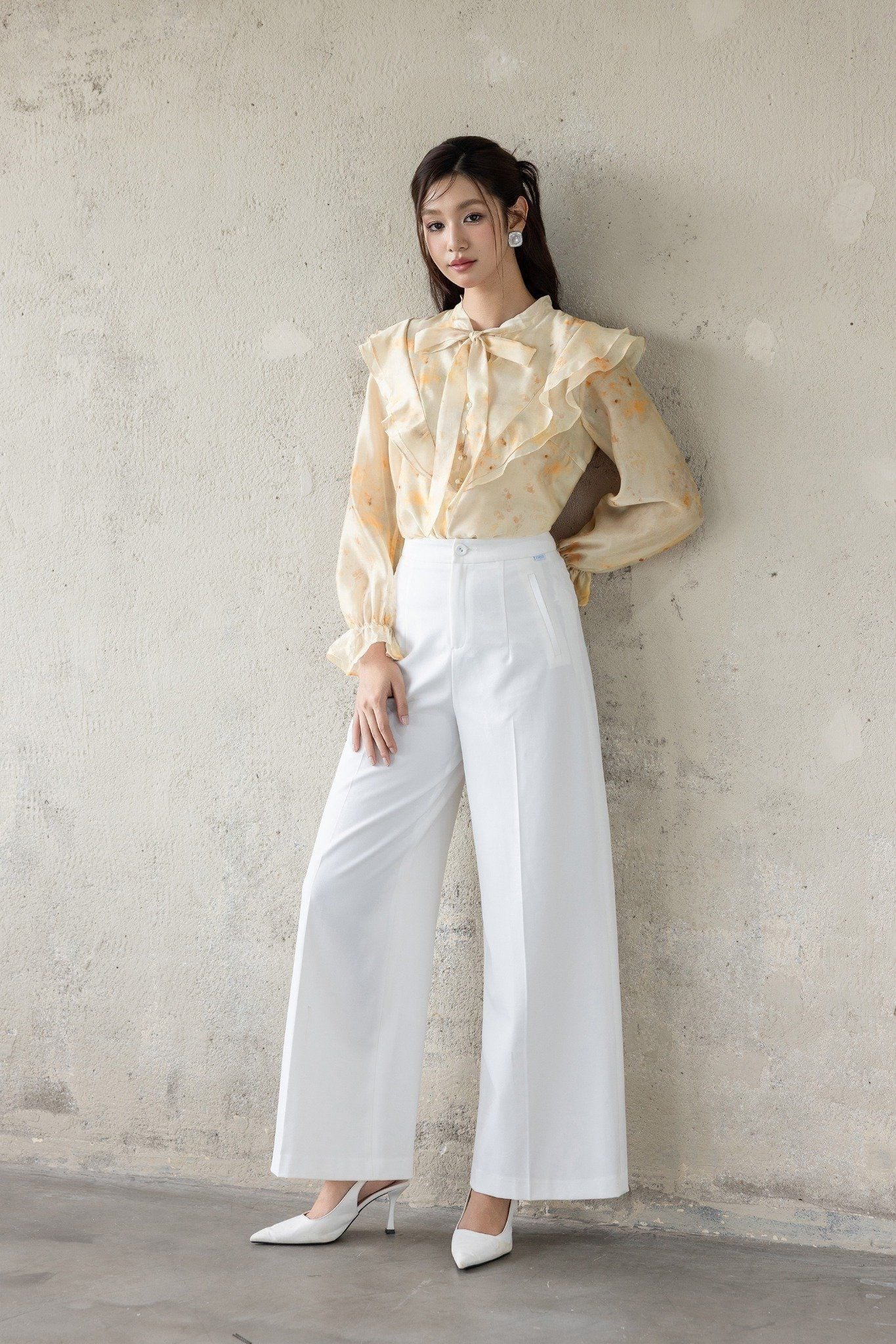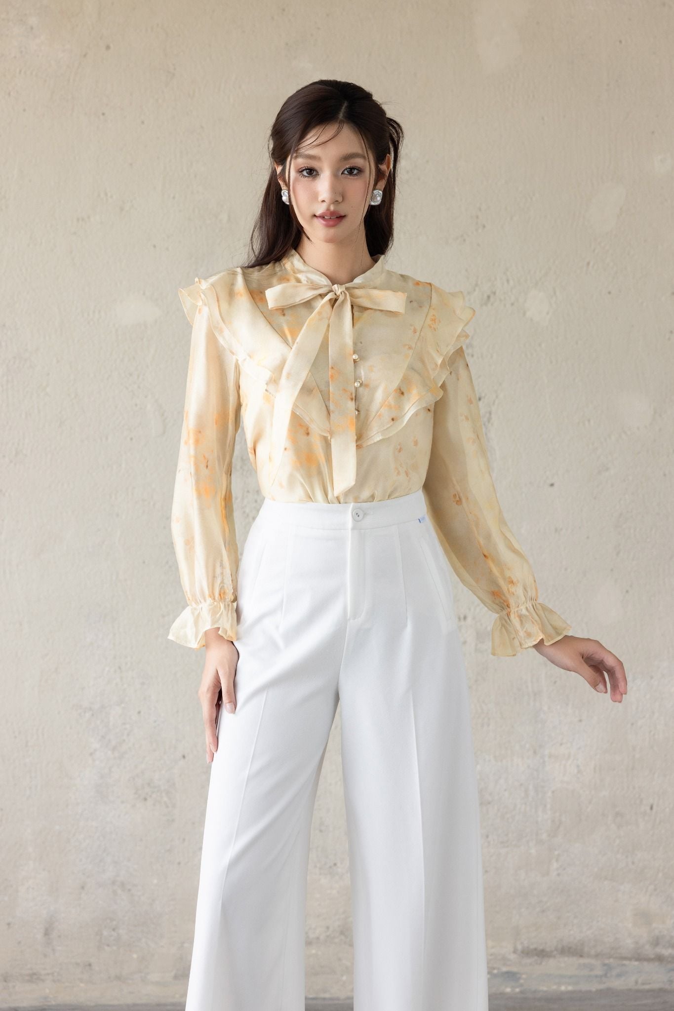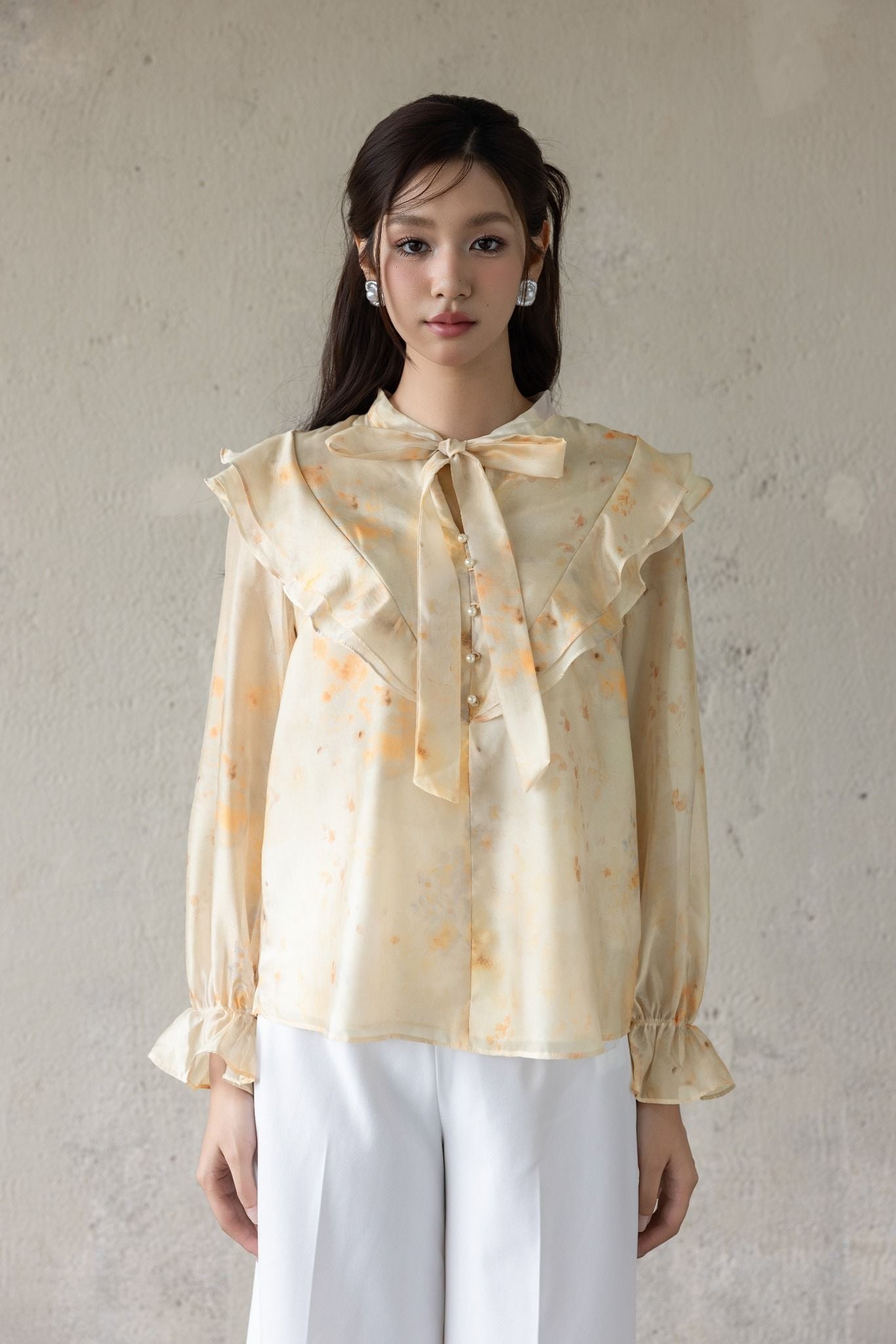 Kiểu dáng: áo sơ mi thiết kế tay dài bồng nhẹ, áo dáng suông và chiều dài áo vừa phải có thể sơ vin hoặc thả suông. Áo sử dụng tone màu be kết hợp hoạ tiết loang, cùng nơ bản to phần cổ tạo điểm nhấn