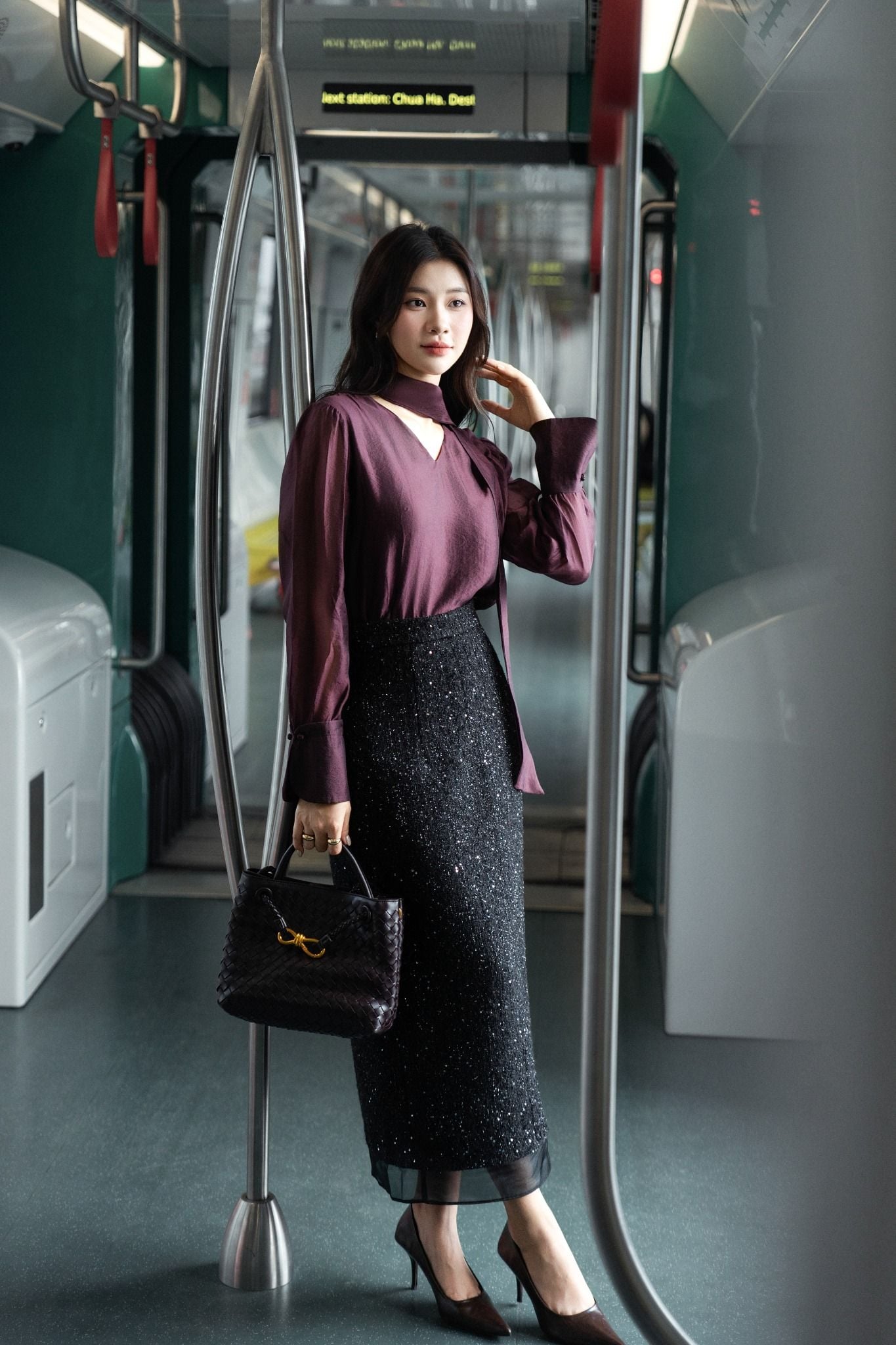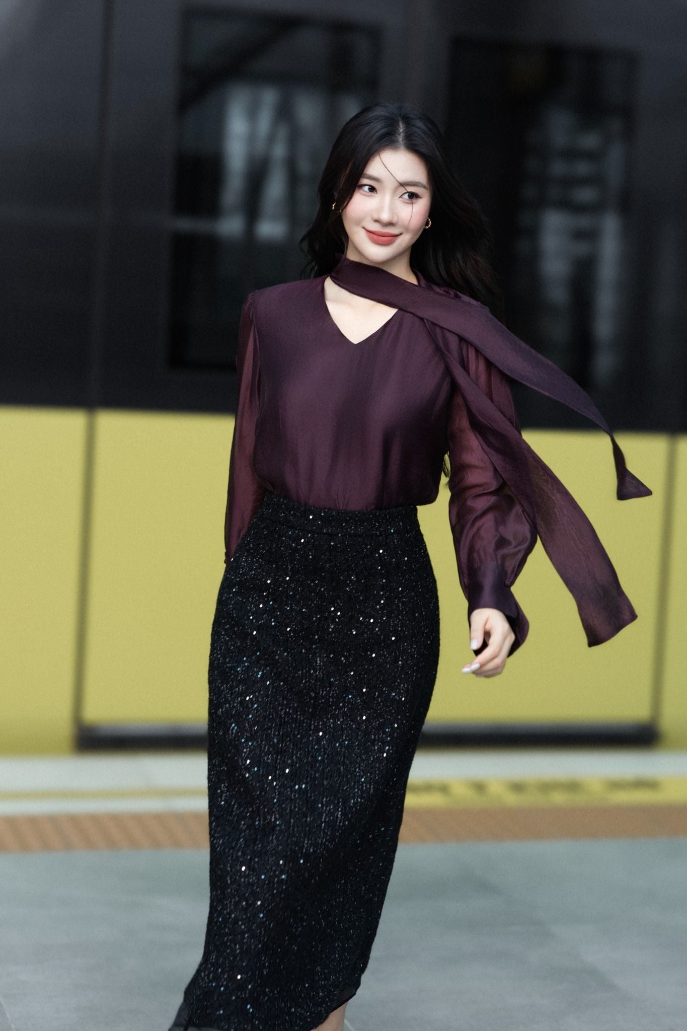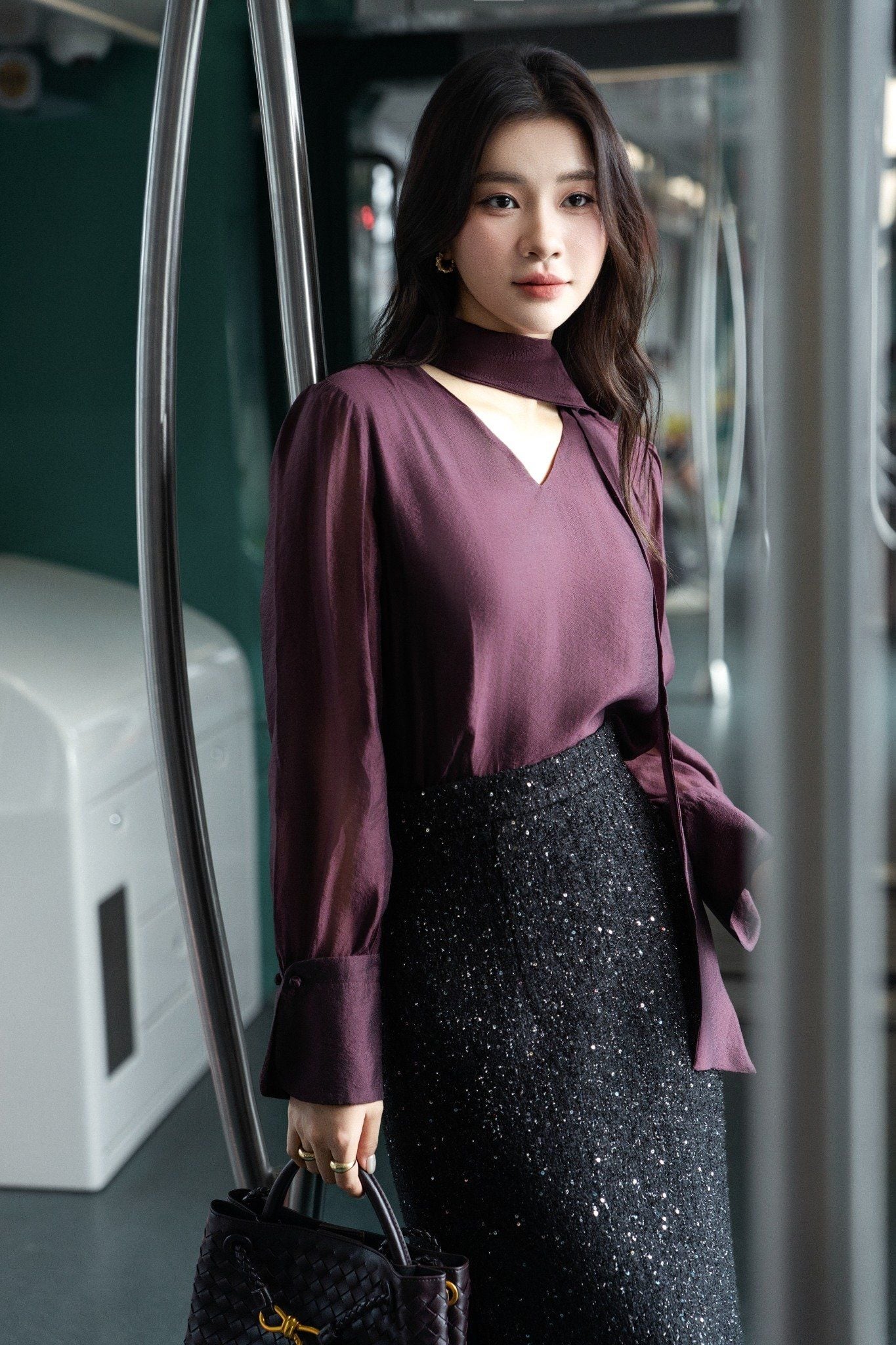 Kiểu dáng: áo sơ mi thiết kế tay dài bồng nhẹ, áo dáng suông và chiều dài áo vừa phải có thể sơ vin hoặc thả suông. Áo sử dụng tone đỏ tím kết hợp dải lụa cách điệu phần cổ áo