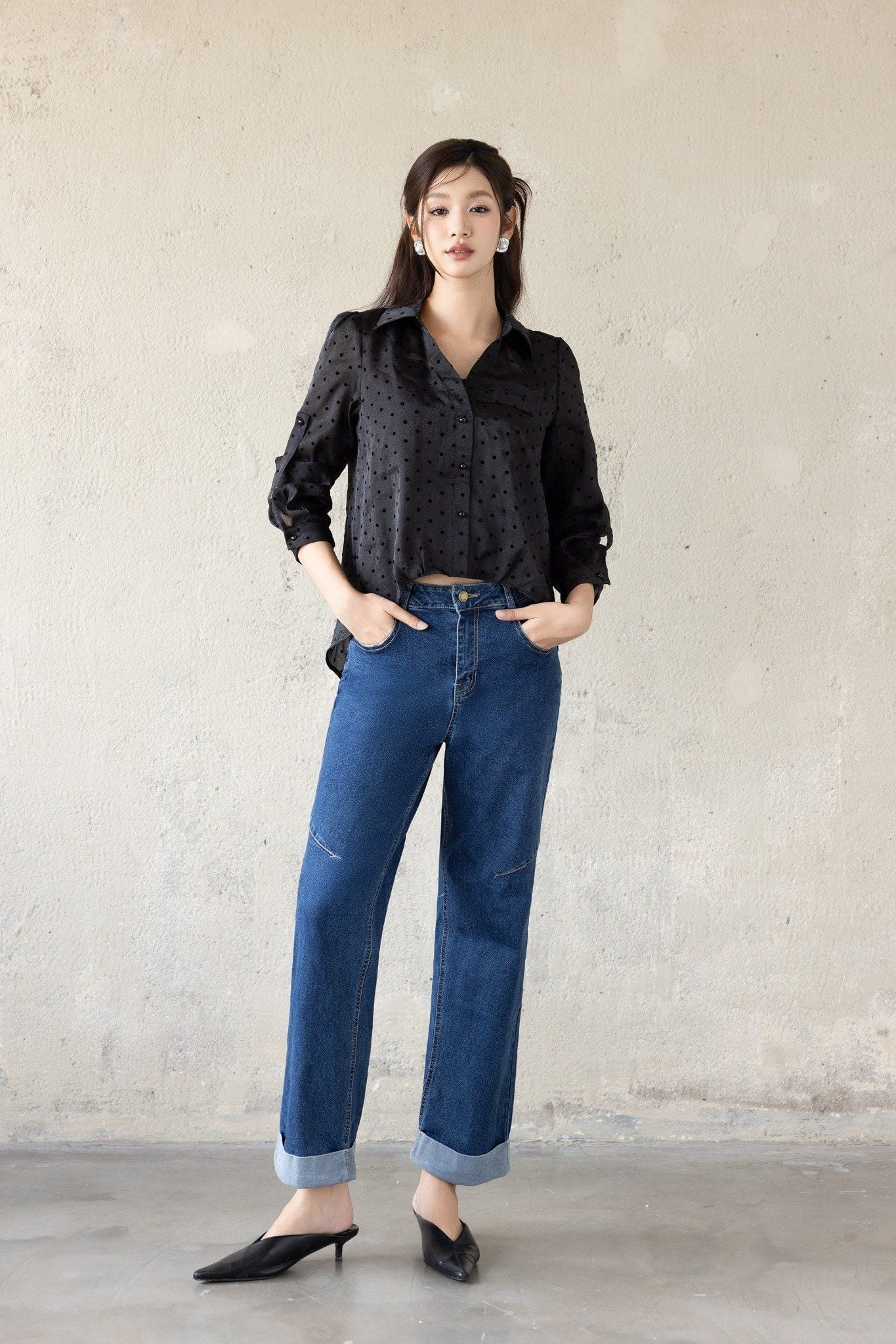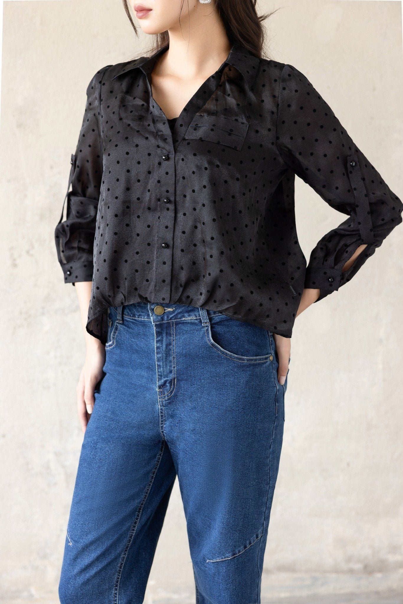 Kiểu dáng: áo sơ mi thiết kế tay dài bồng nhẹ, áo dáng low - high cách điệu, phù hợp thả suông. Áo sử dụng tone màu đen sang trọng cùng hoạ tiết chấm bi nữ tính, có thể kết hợp cùng chân váy công sở hoặc quần jeans