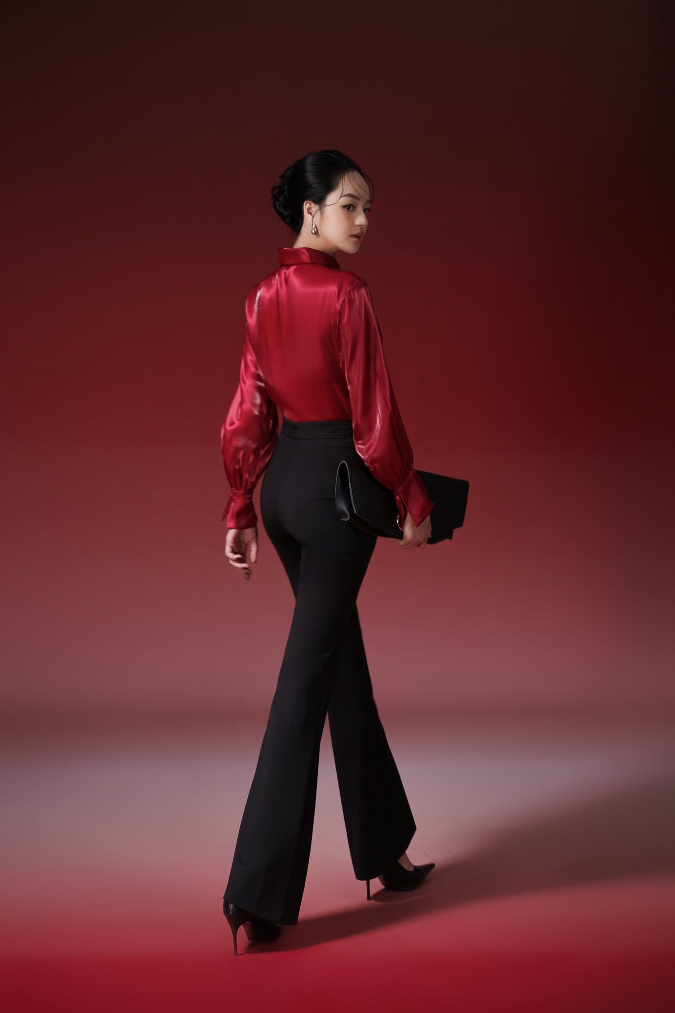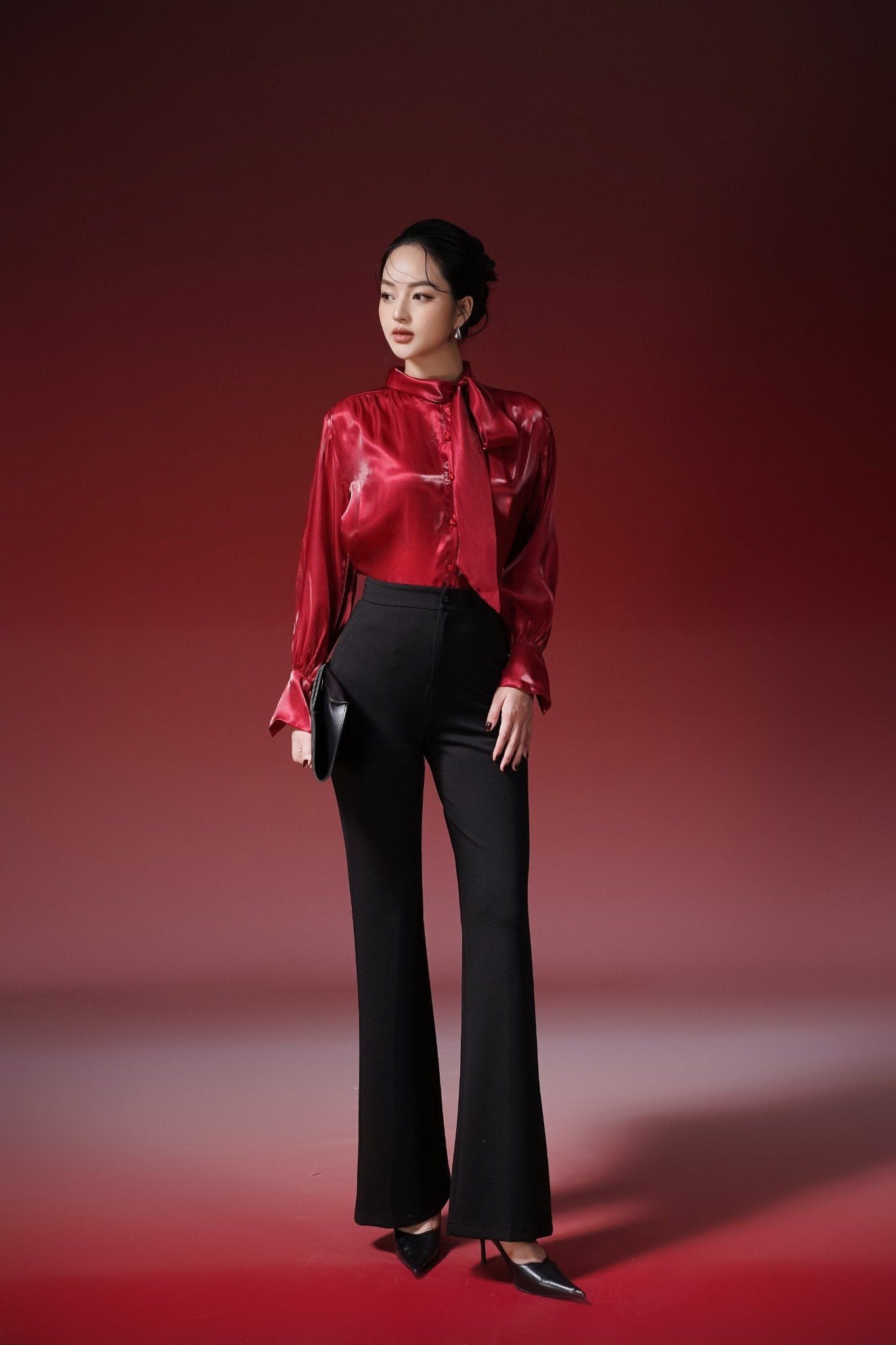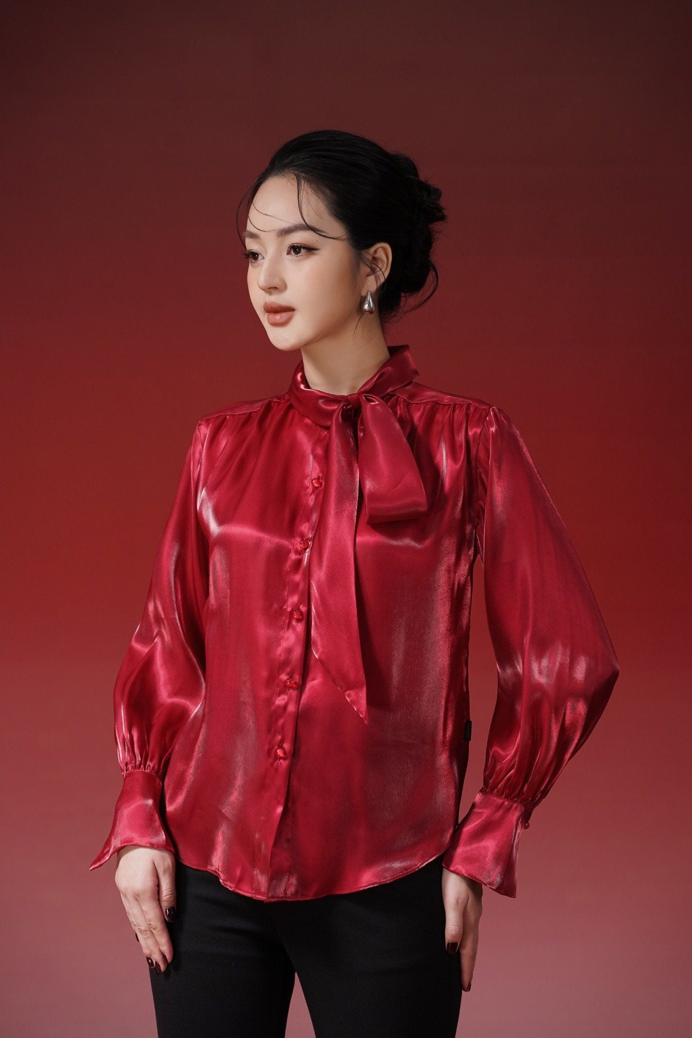 Kiểu dáng: áo sơ mi thiết kế tay dài bồng nhẹ, áo dáng suông và chiều dài áo vừa phải có thể sơ vin hoặc thả suông. Áo sử dụng tone màu đỏ nổi bật kết hợp hoạ tiết loang, cùng nơ bản to phần cổ tạo điểm nhấn