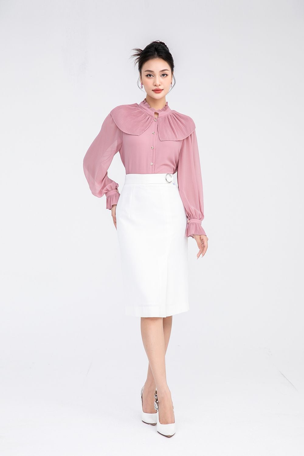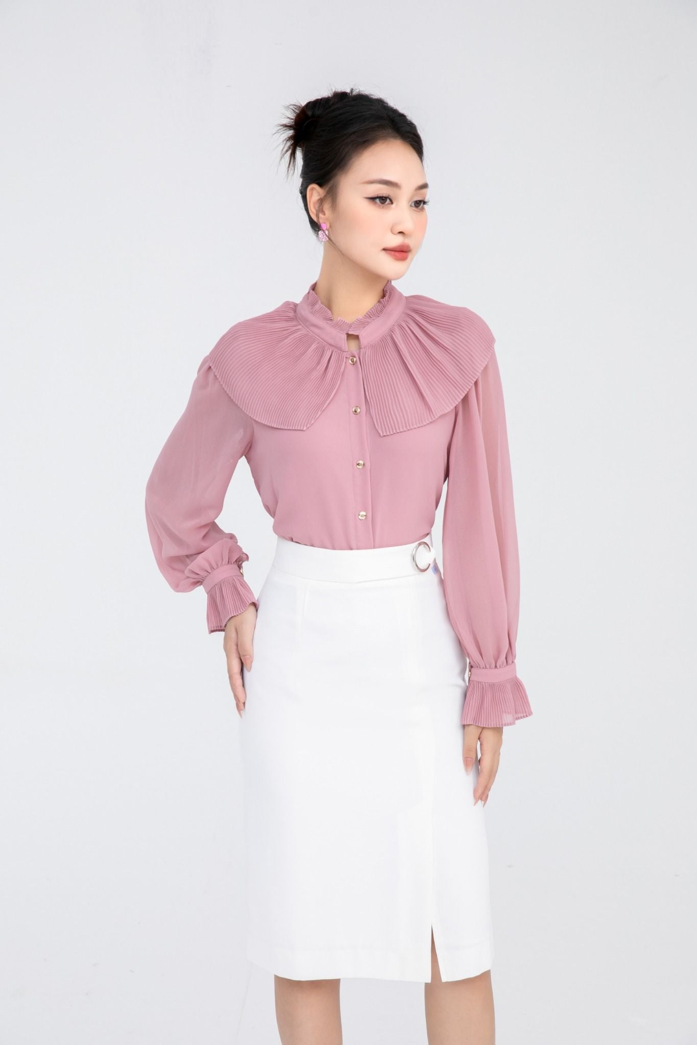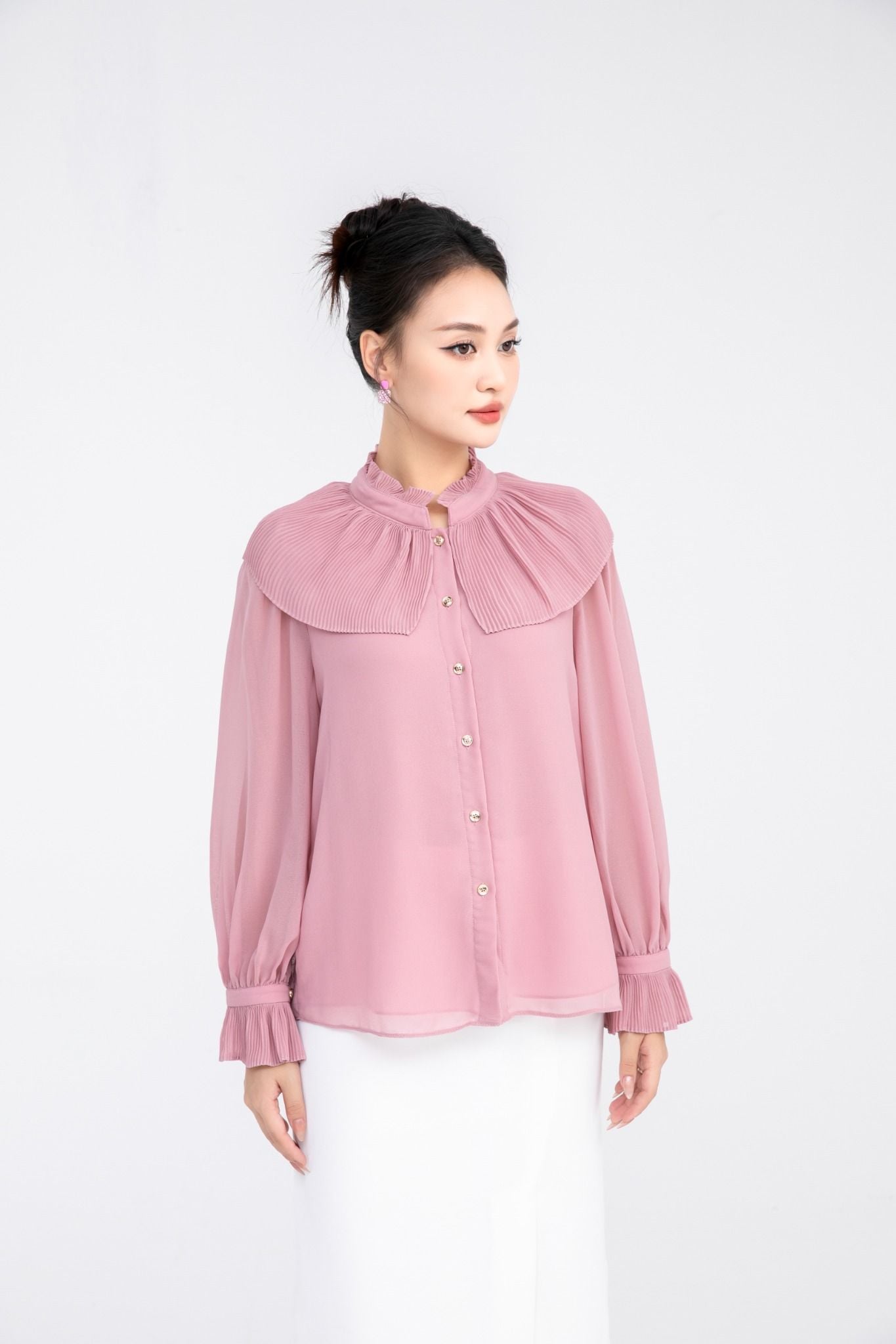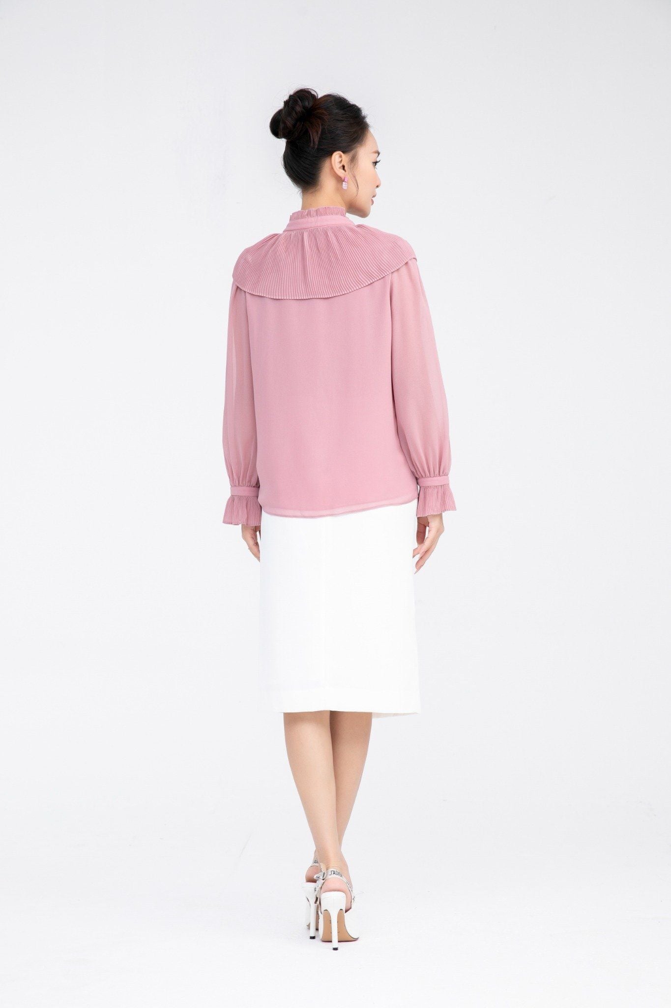 Kiểu dáng: áo thiết kế cổ phối xếp nhún cách điệu, tone màu hồng trơn