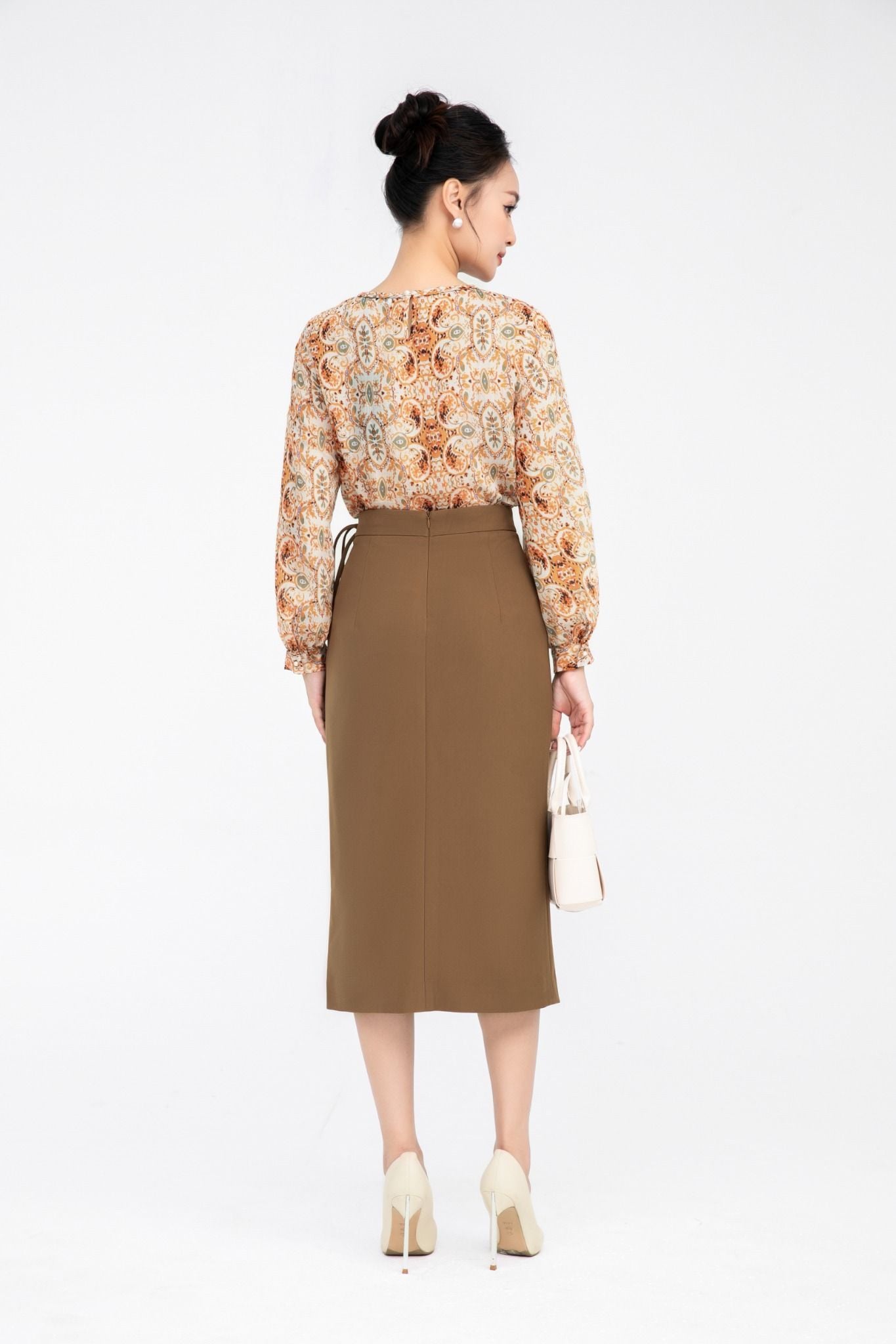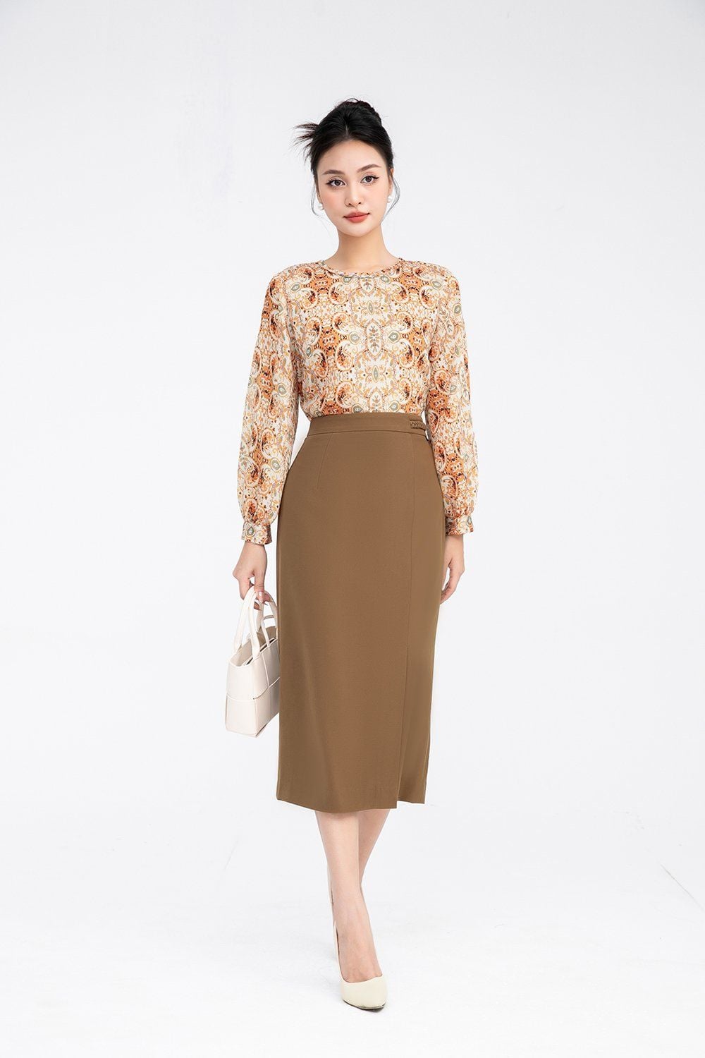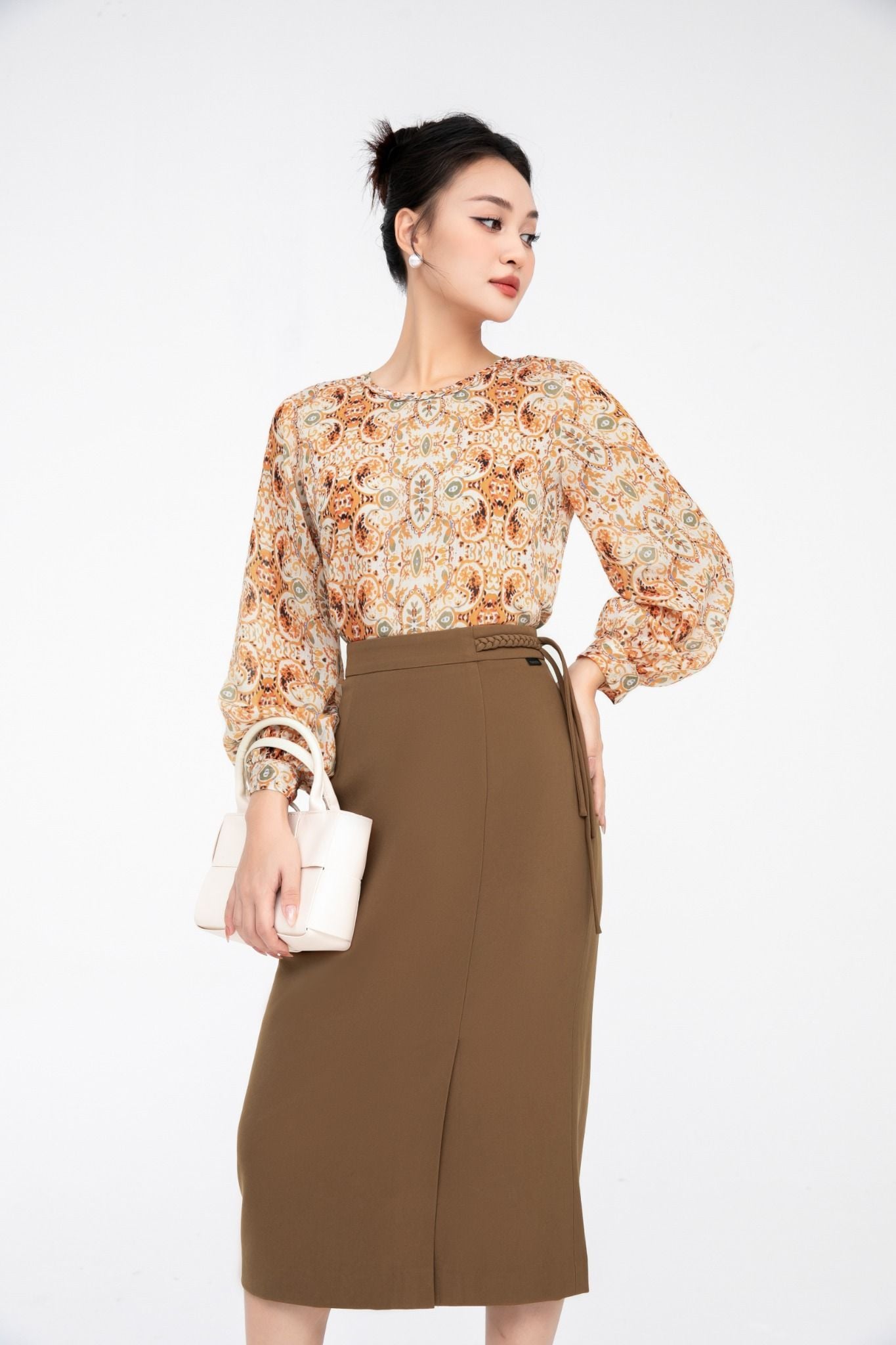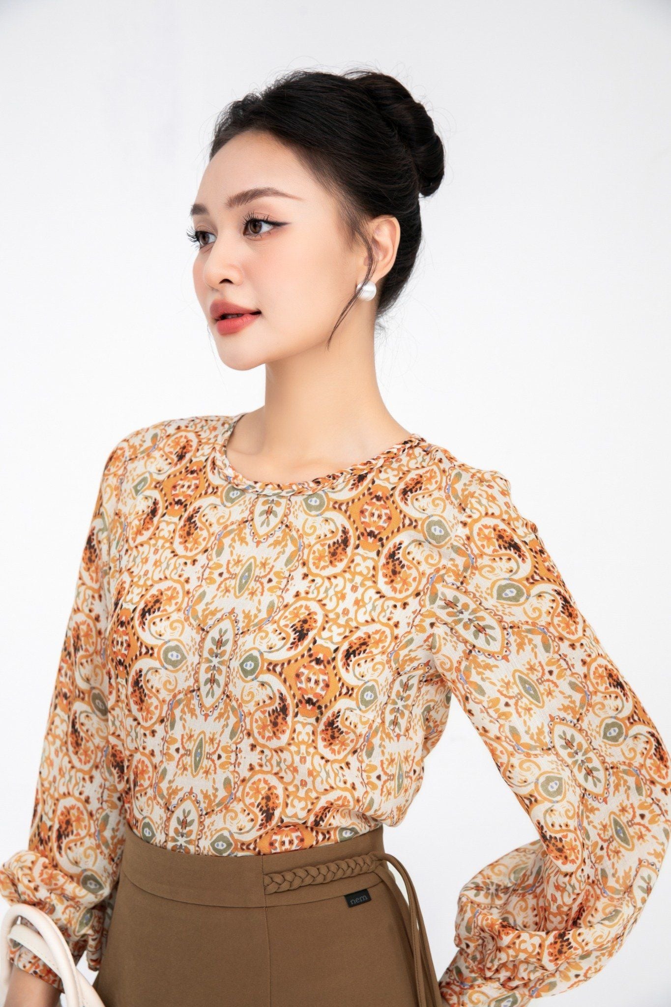 Kiểu dáng: áo thiết kế cổ tròn tay bồng, kết hợp họa tiết
