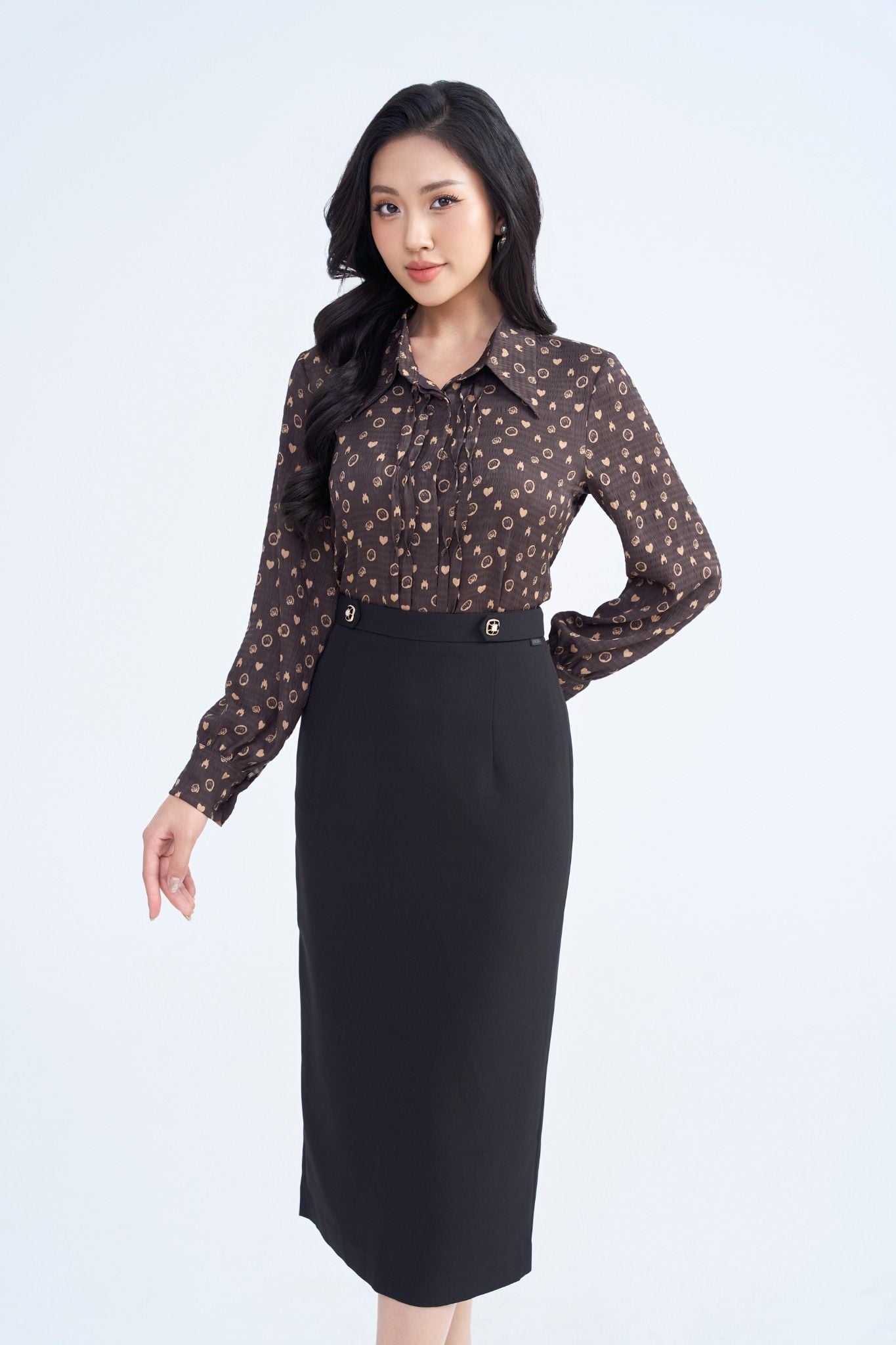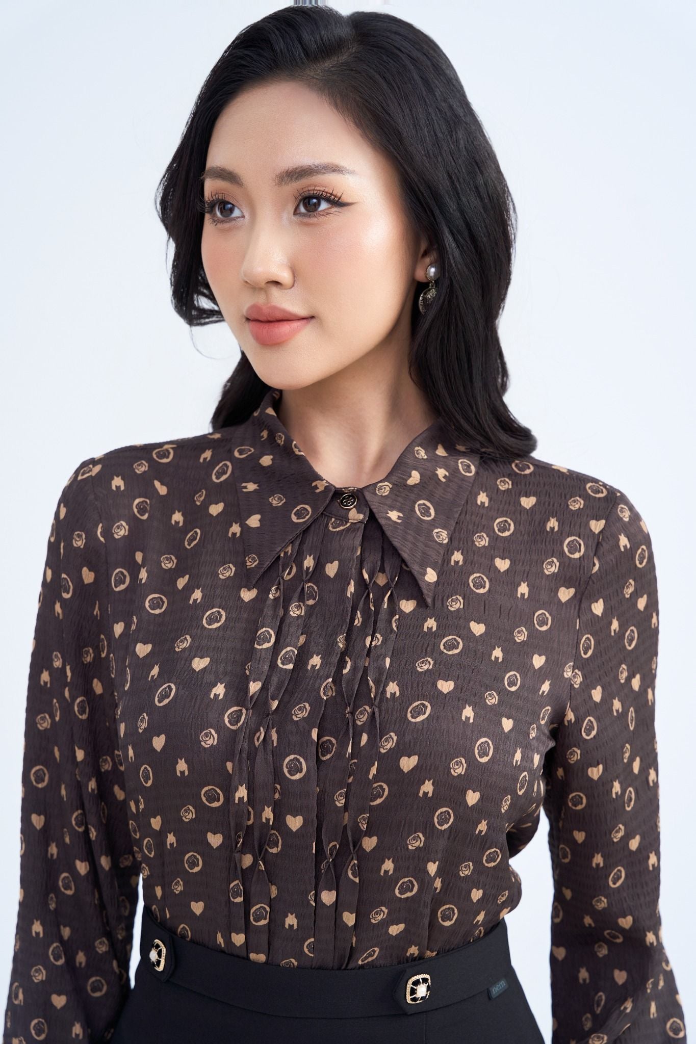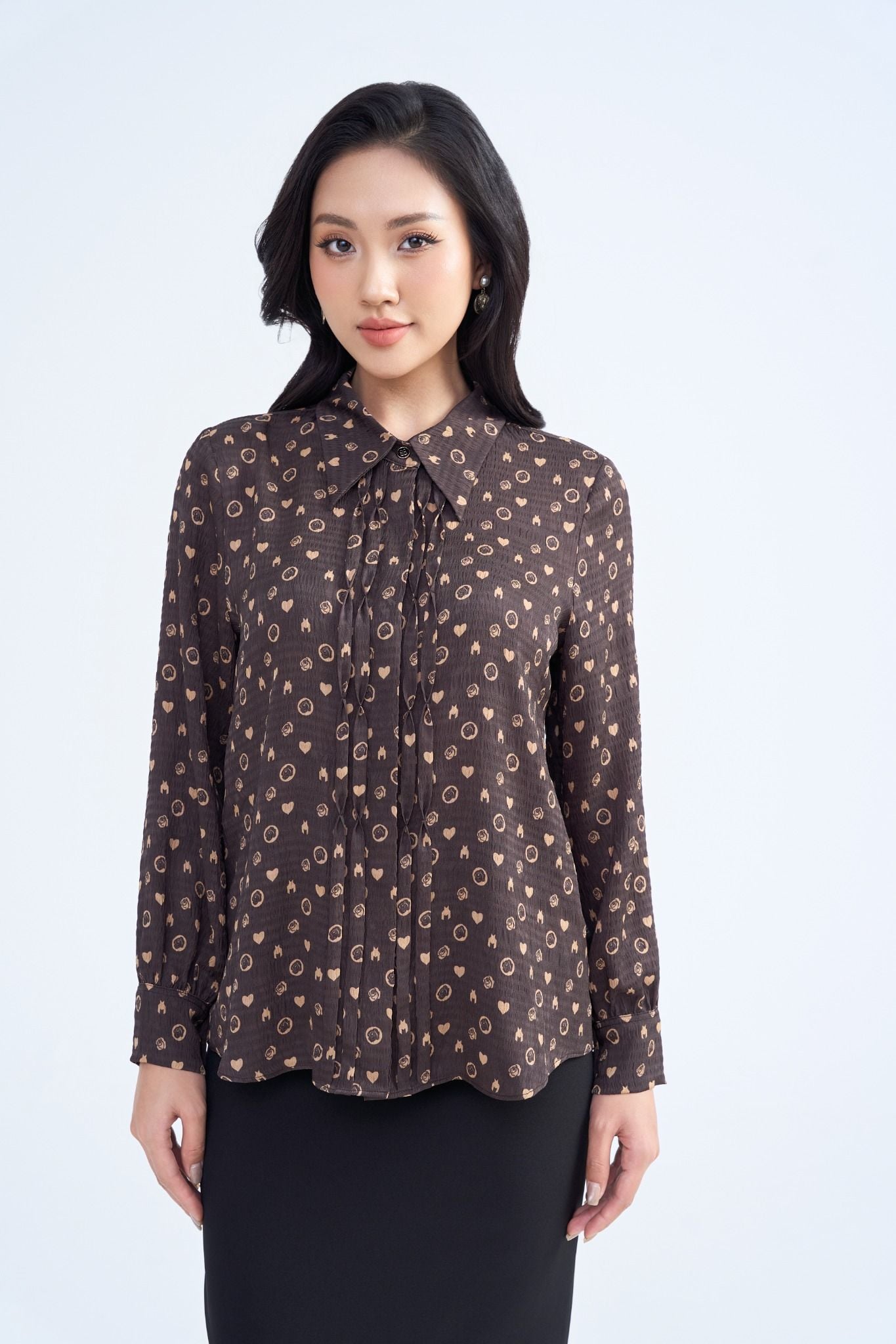 Kiểu dáng: áo thiết kế tay bồng, tone màu nâu đậm phối họa tiết in