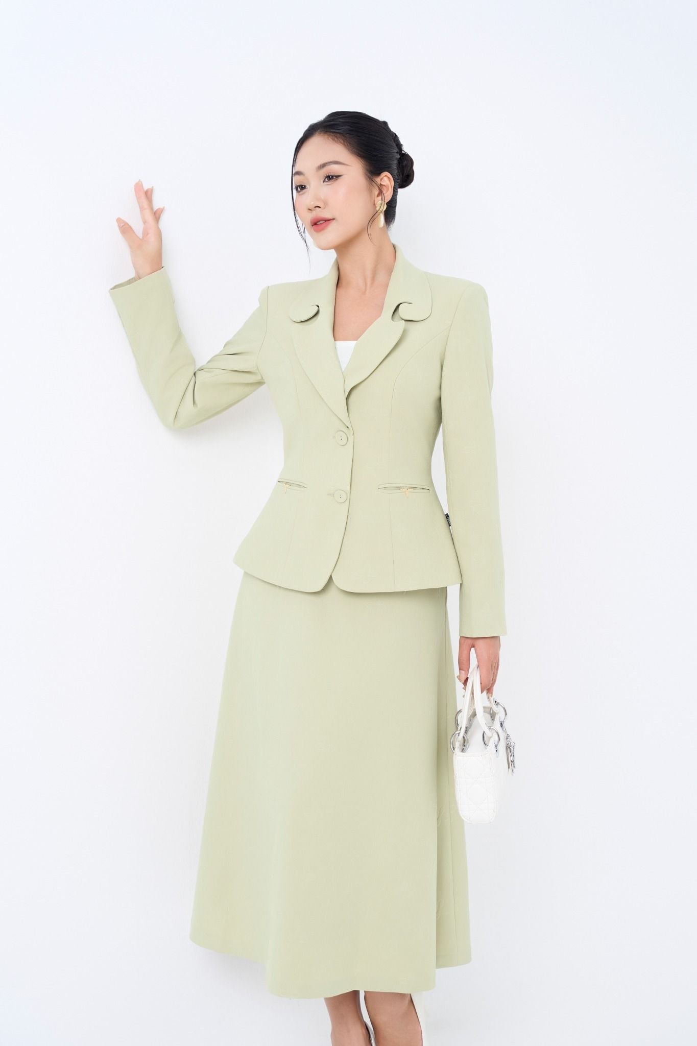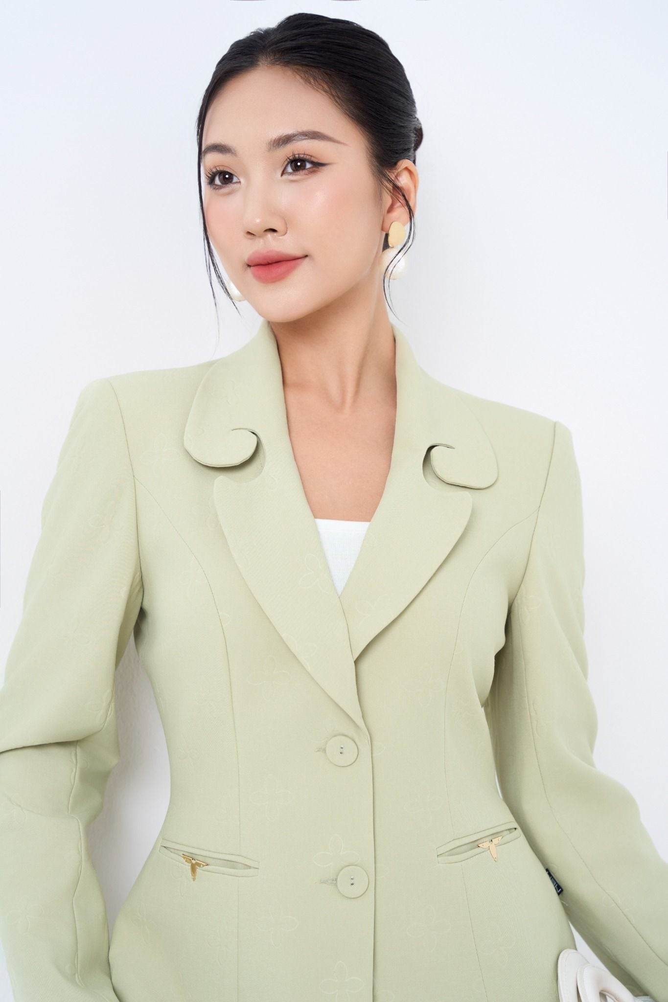 Kiểu dáng: áo vest thiết kế dáng chiết eo, cổ cách điệu, tone màu xanh trơn