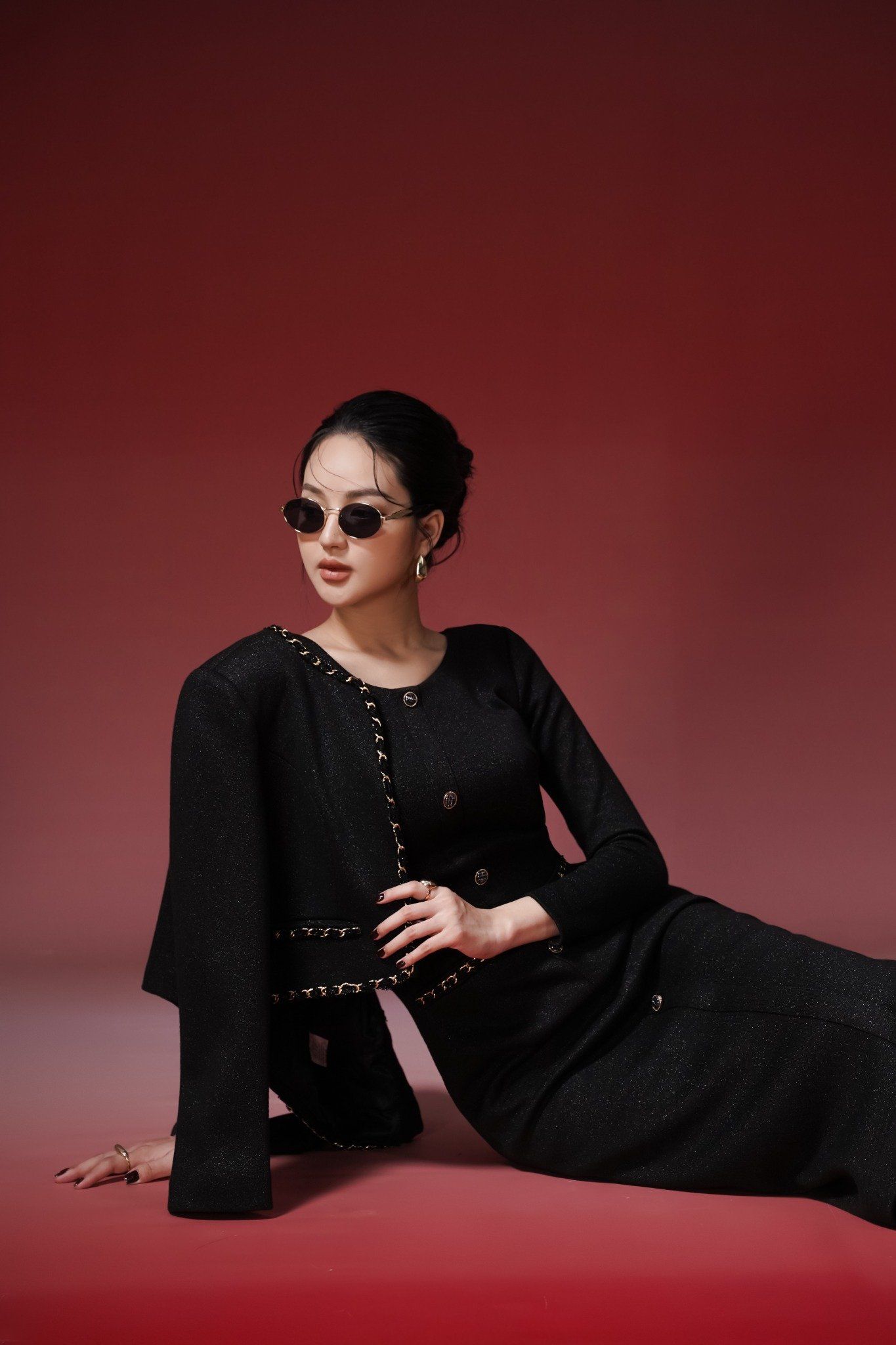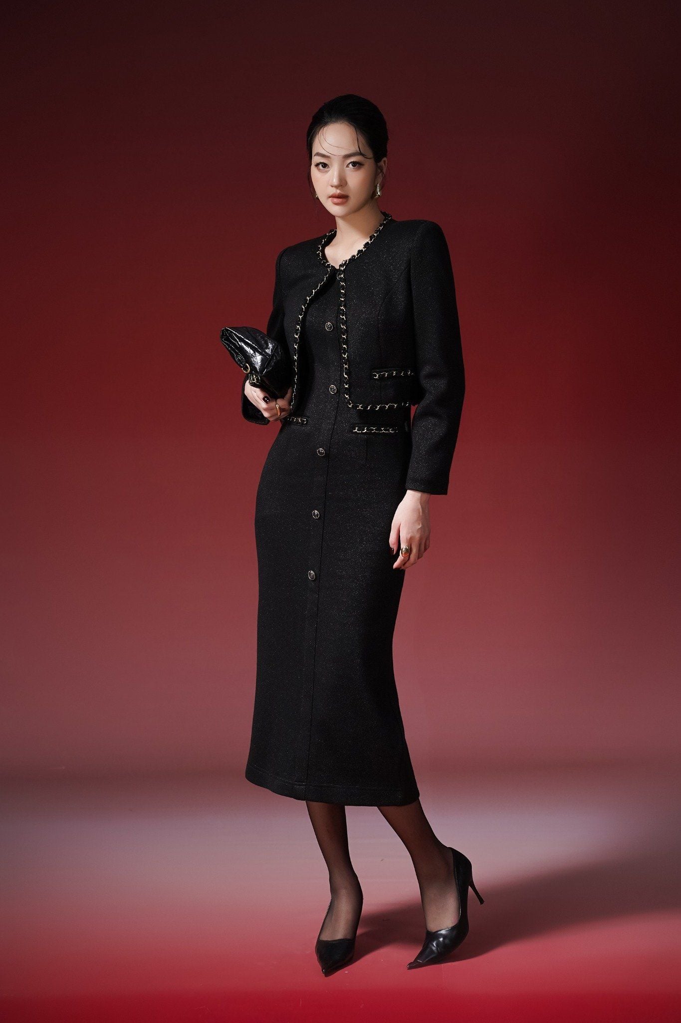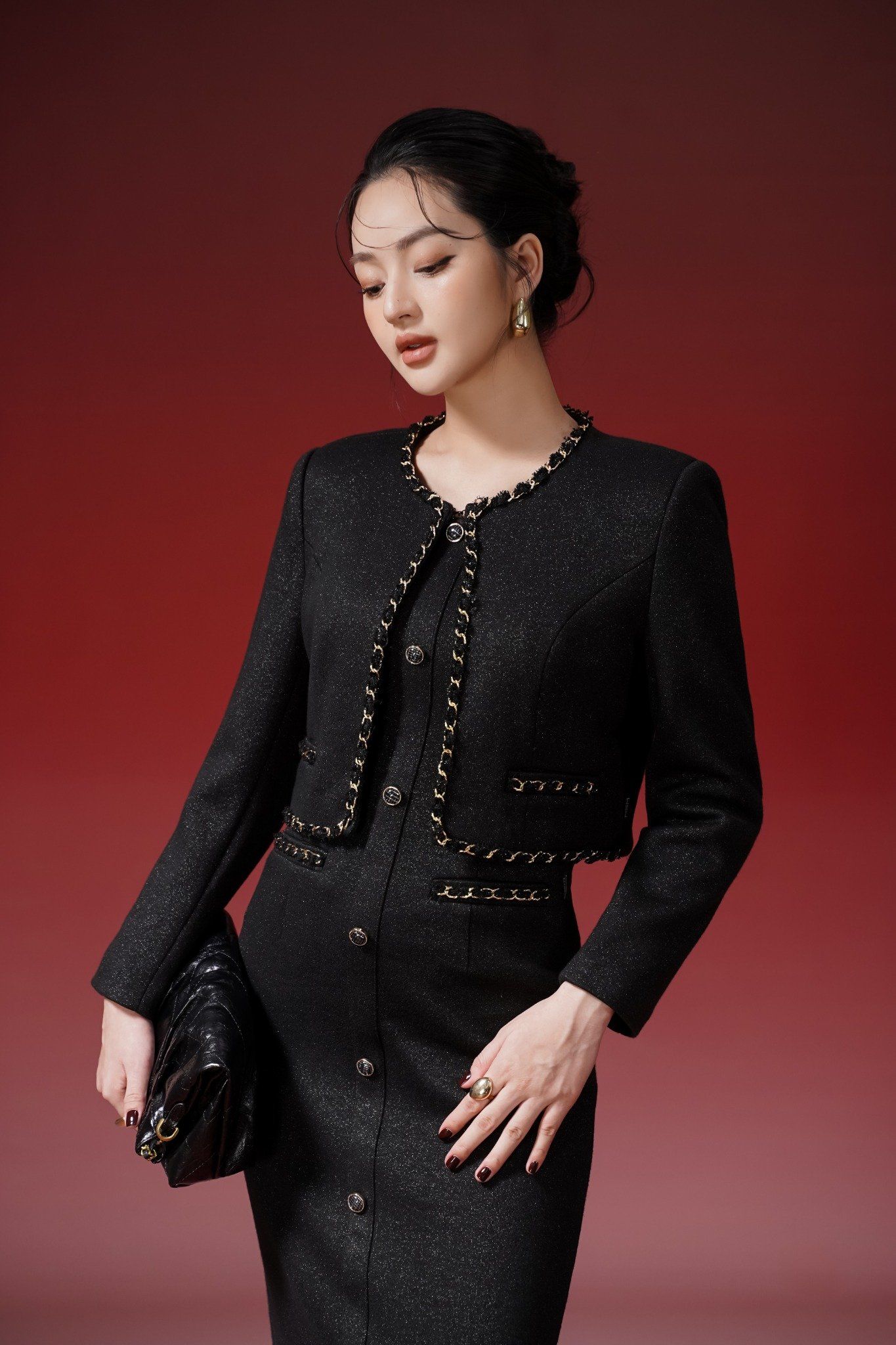 Kiểu dáng: áo khoác thiết kế dáng ngắn trẻ trung. Áo sử dụng tone màu đen ánh nhũ phối viền xích kim loại nổi bật