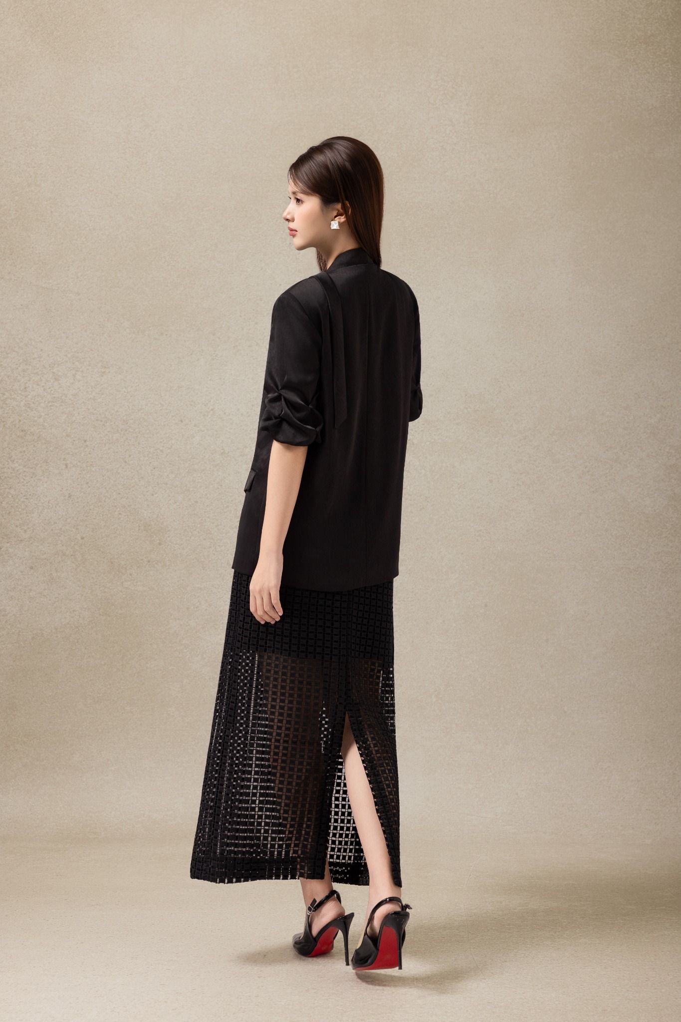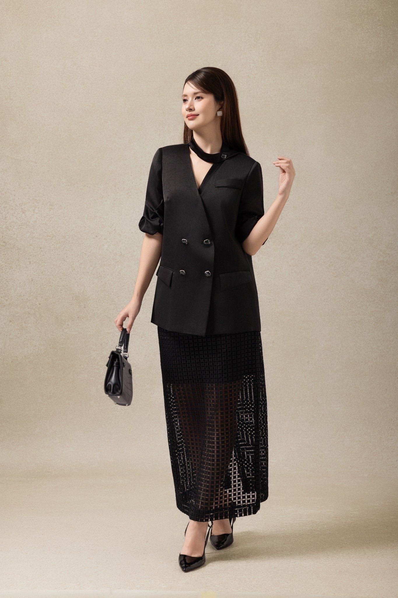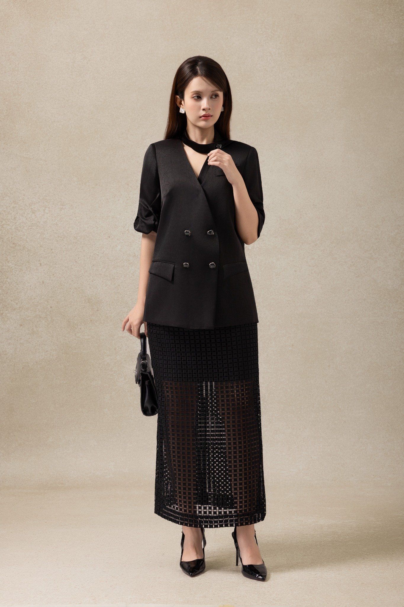Kiểu dáng: áo công sở thiết kế ngắn tay, dáng suông rộng mang tới sự trẻ trung cho người mặc. Áo sử dụng tone màu đen kết hợp hàng khuy kim loại phía trước mang tới sự thanh lịch, sang trọng