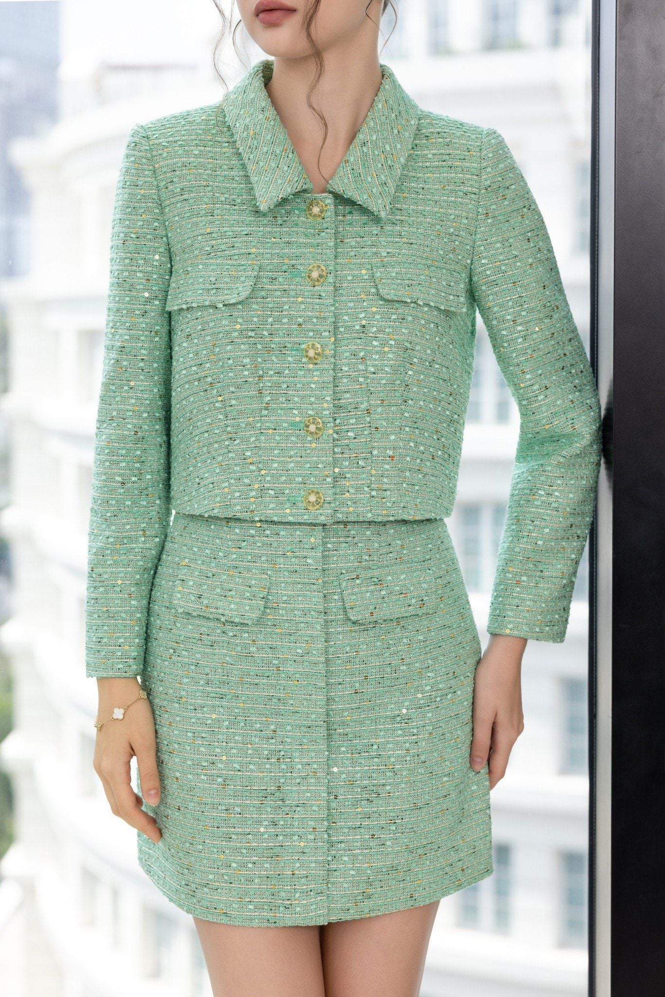 Kiểu dáng: áo công sở thiết kế dài tay, dáng suông nhẹ cùng chiều dài vừa phải giúp người mặc giữ được sự thanh lịch mà trẻ trung hơn các dáng áo truyền thống, tone màu xanh lá kết hợp hàng khuy kim loại đính cài phía trước